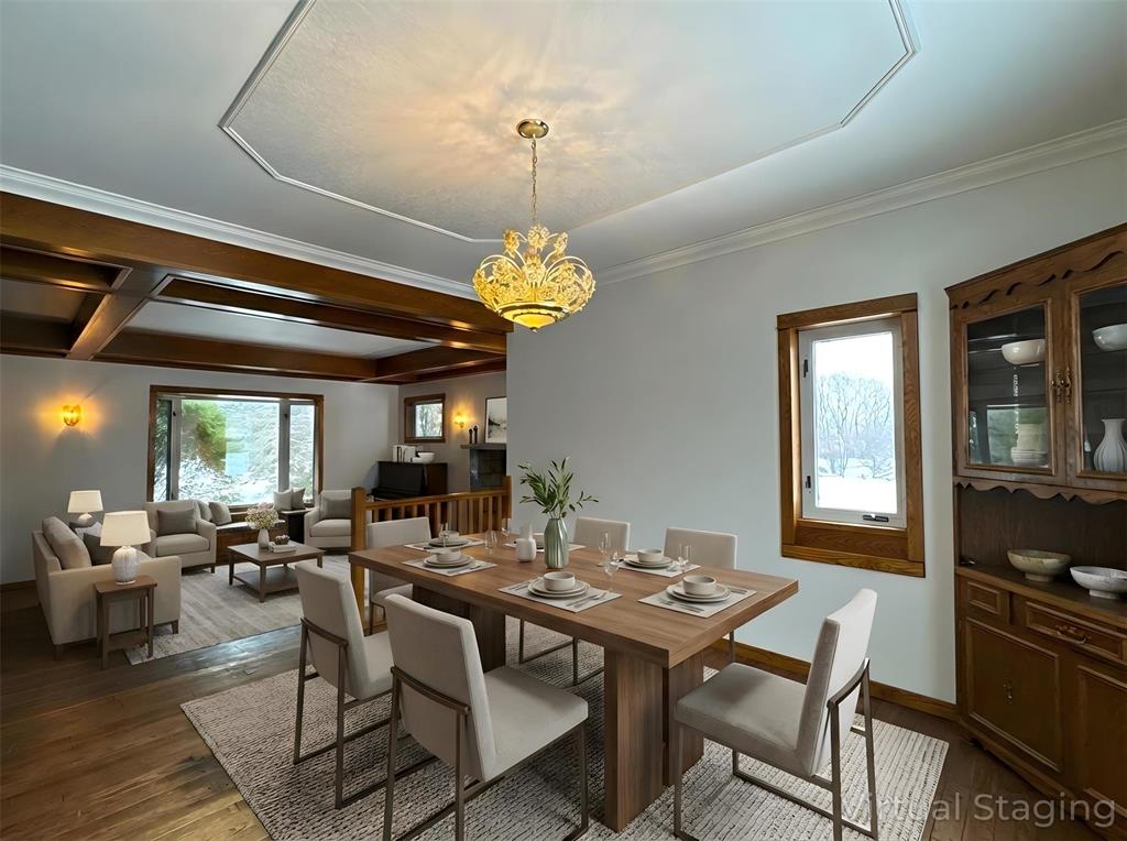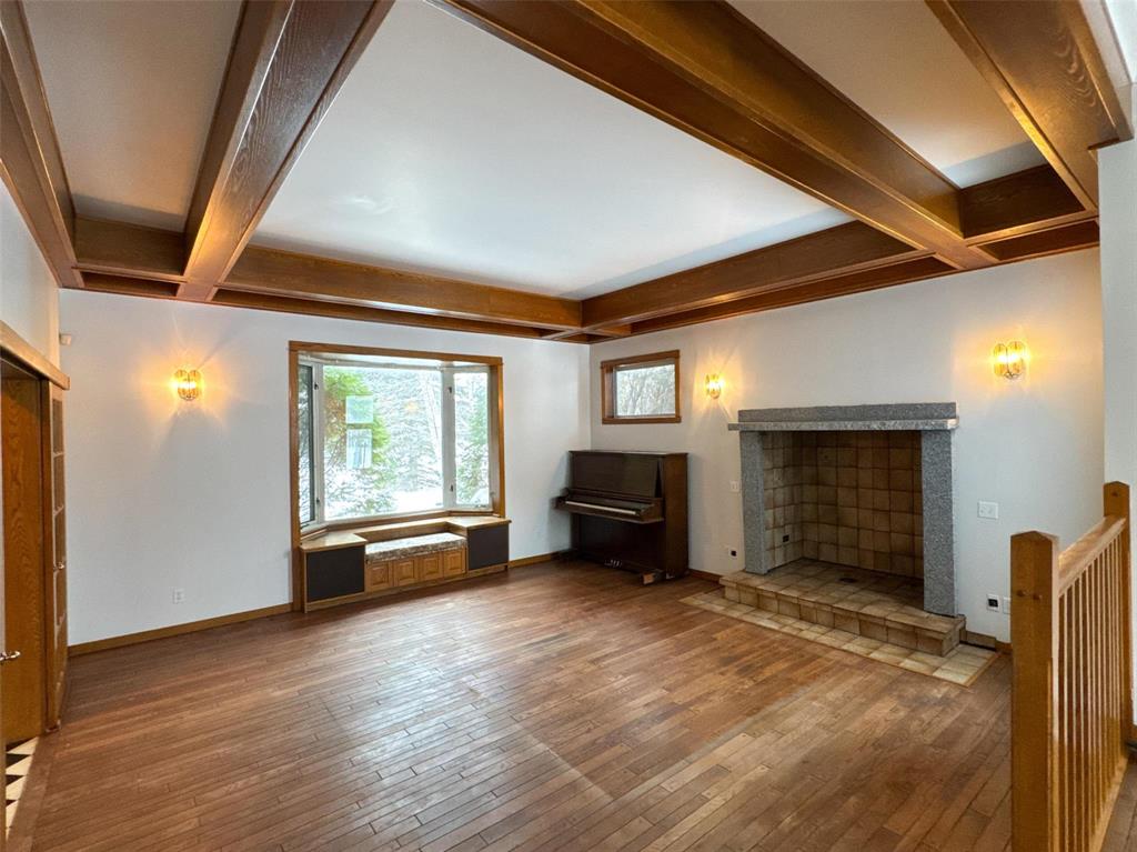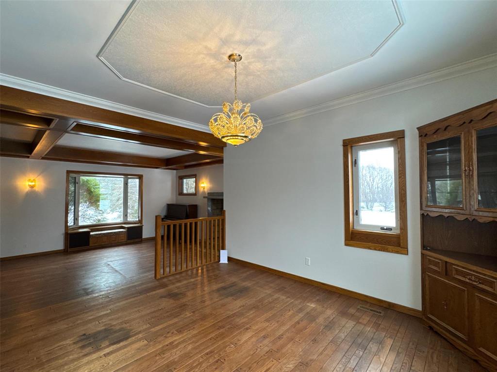 areas include two dining rooms, a large living room with fireplace and beautiful real wood flooring, plus