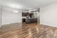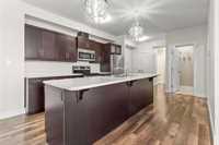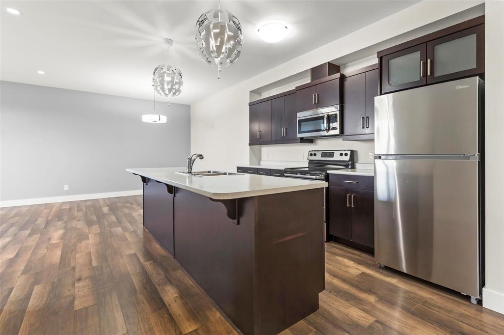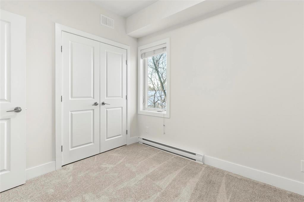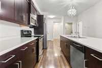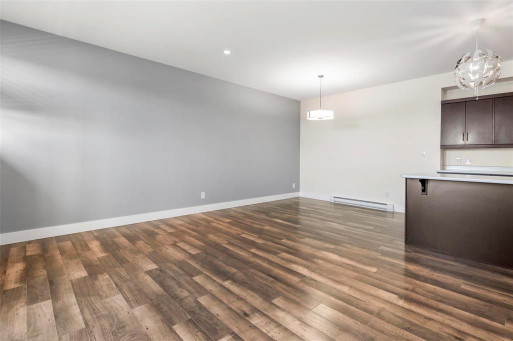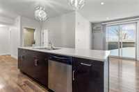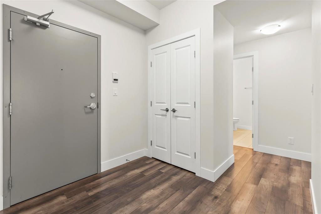 This 919 square foot top floor two bedroom condo blends contemporary style with smart functionality—and includes TWO parking stalls. Freshly painted and brand new carpet in bedrooms! A welcoming front entry leads to a sleek galley kitchen with an extended eating island, ideal for casual meals and entertaining. The open-concept layout showcases warm laminate flooring, 9’ ceilings, and an oversized 8’ sliding door opening to a private balcony. The primary bedroom is thoughtfully separated from the main living area for added privacy, while a combined laundry and storage room enhances everyday convenience. With only one shared wall, the home is designed for peace and quiet. Features include HRV, wall A/C, in-suite washer and dryer, stainless steel appliances, and window coverings. Bold architecture and inviting common areas make 5 FIVE 5 a standout address.