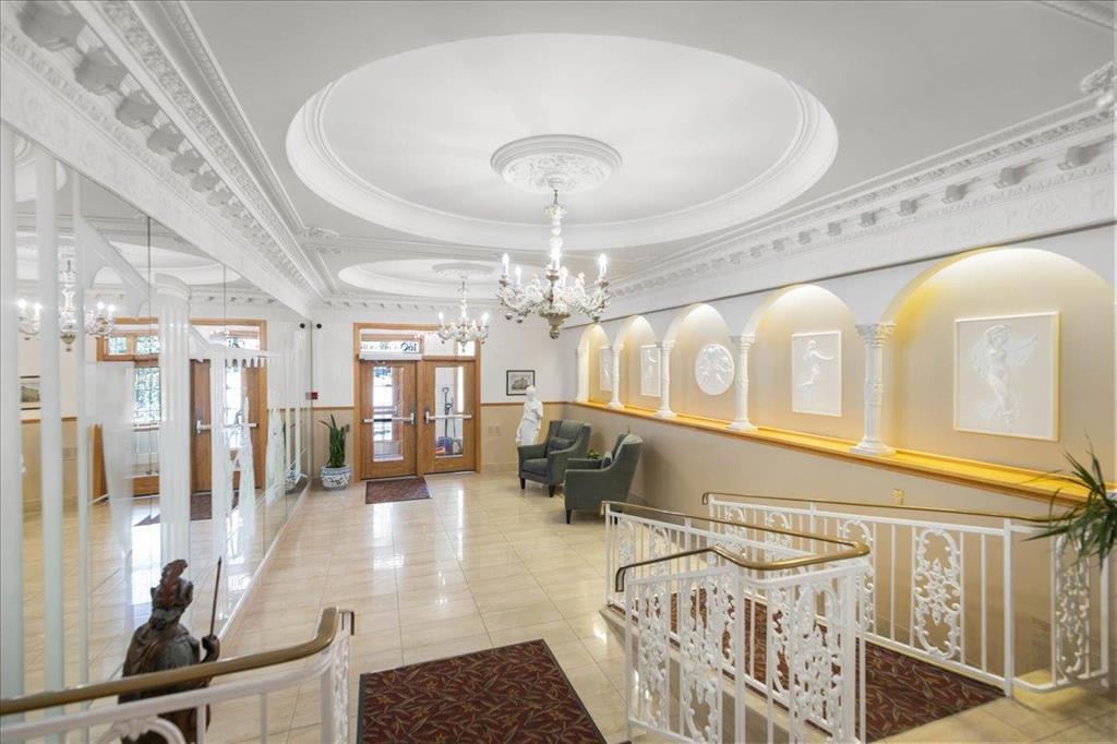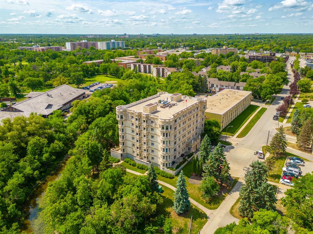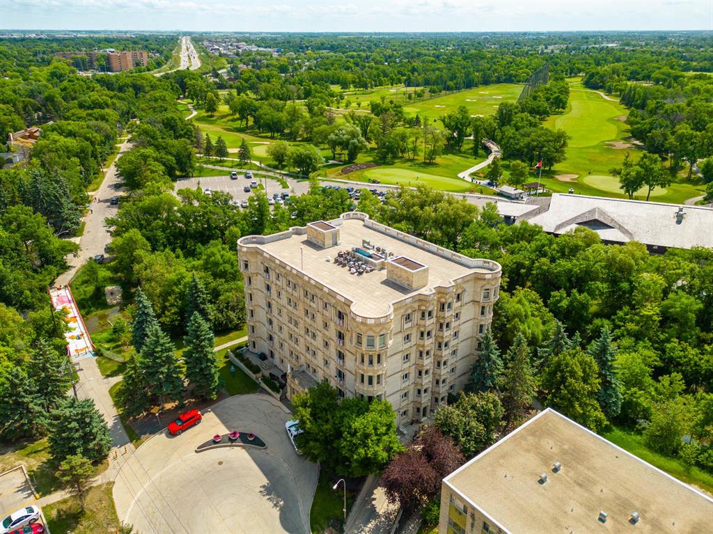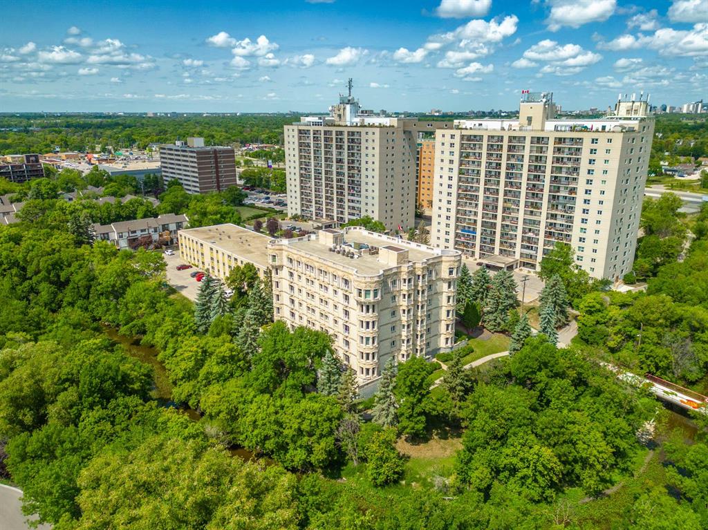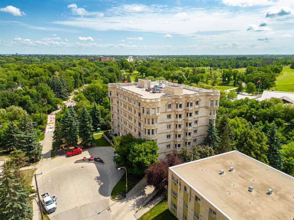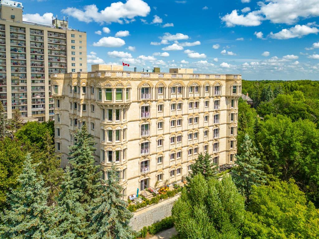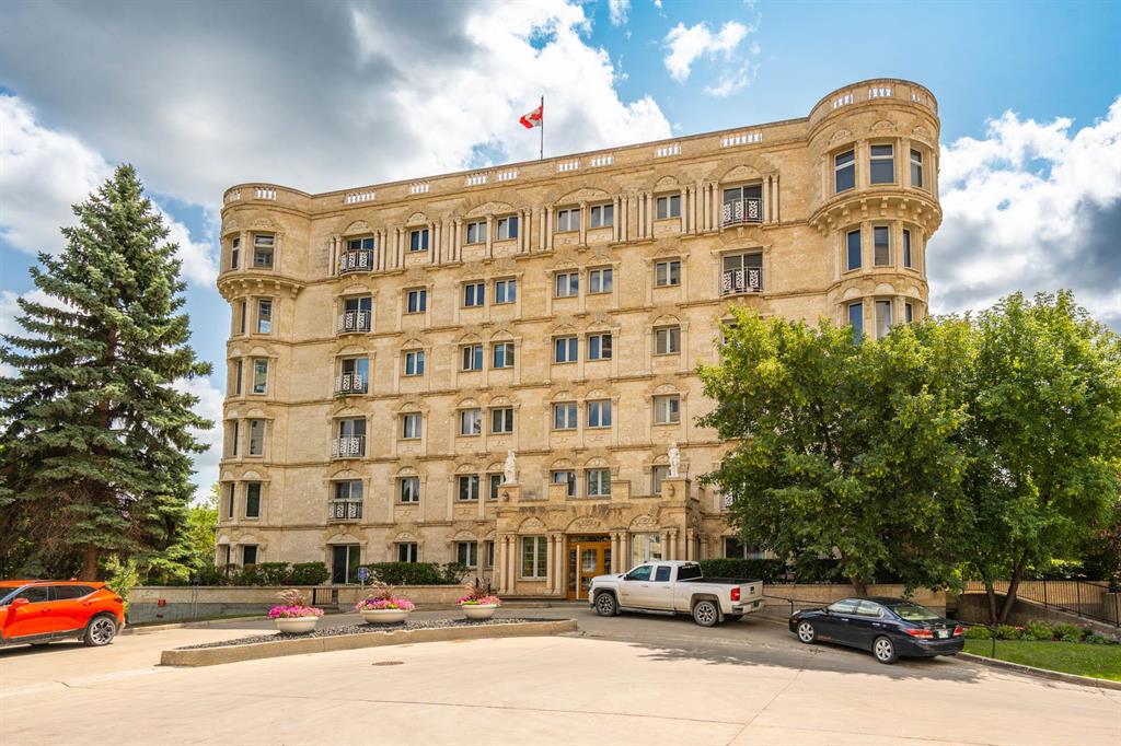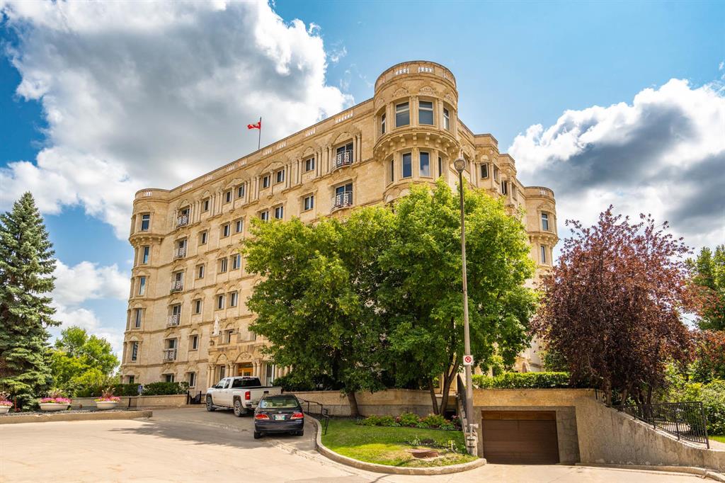 STUNNING LUXURY EXECUTIVE CONDO...Approx $125K recently invested in total renovation. Here is your chance to own one of the rarely available units in the Castle on the Seine! This sought after bldg boasts an architectural masterpiece that captivates you with its grand entrance into an elegant European Castle style lobby. Spacious 1700sf two bedroom, two bath unit flooded with natural light, intricately designed crown moldings & high ceilings. Luxury quartz kitchen w/large island, white cabinets (soft-close doors, under cabinet lighting as well as some interior cabinet lighting), built-in wine fridge and quality S/S appliances. Formal DR, LR features turret, porcelain entertainment wall w/linear electric fireplace & 65" Samsung Frame TV included. Patio door opens onto Juliette balcony. Large master bedroom with two full closets (including a walk-in), huge 3-pce. ensuite w/jacuzzi tub. In-suite laundry/office. Neutral decor and engineered hwd flrs. Newer Energy Efficient furnace '24 and Hot Water Tank '25. Concrete bldg, underground prkg, and roof top patio. Neighboring on the Niakwa Golf Course and just steps away from walking paths along the Seine. Fantastic location close to everything!