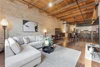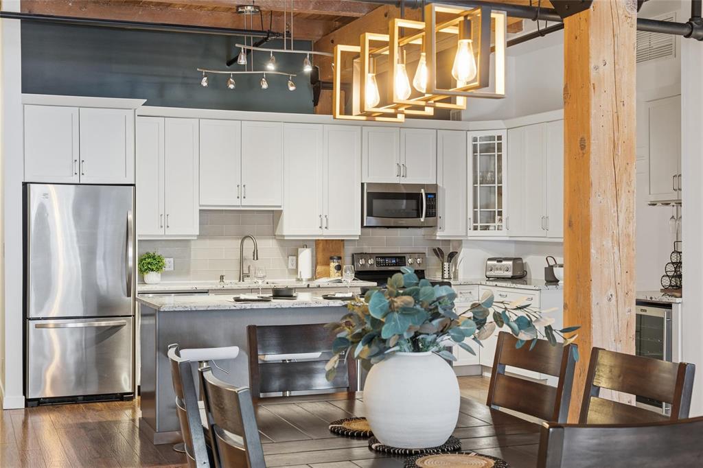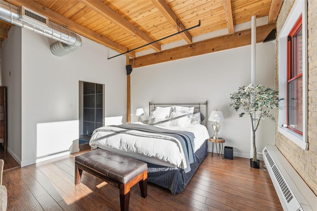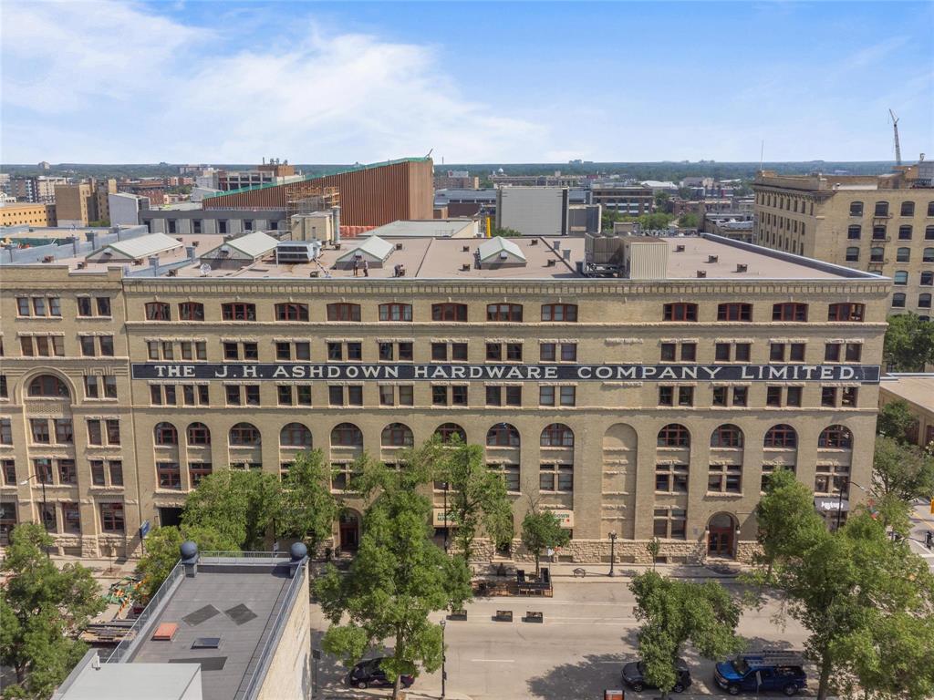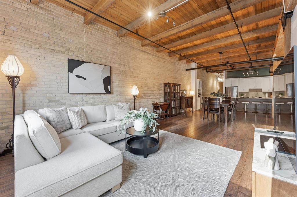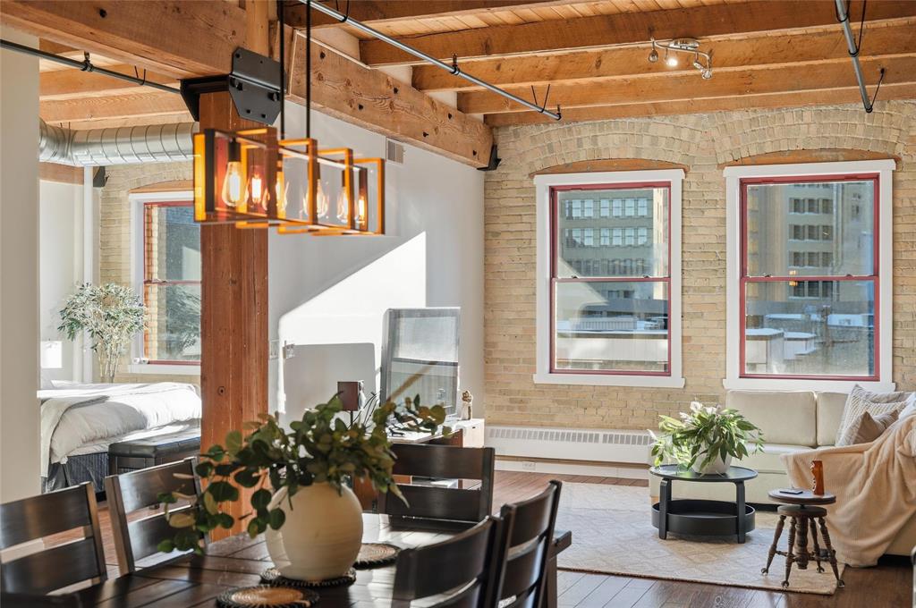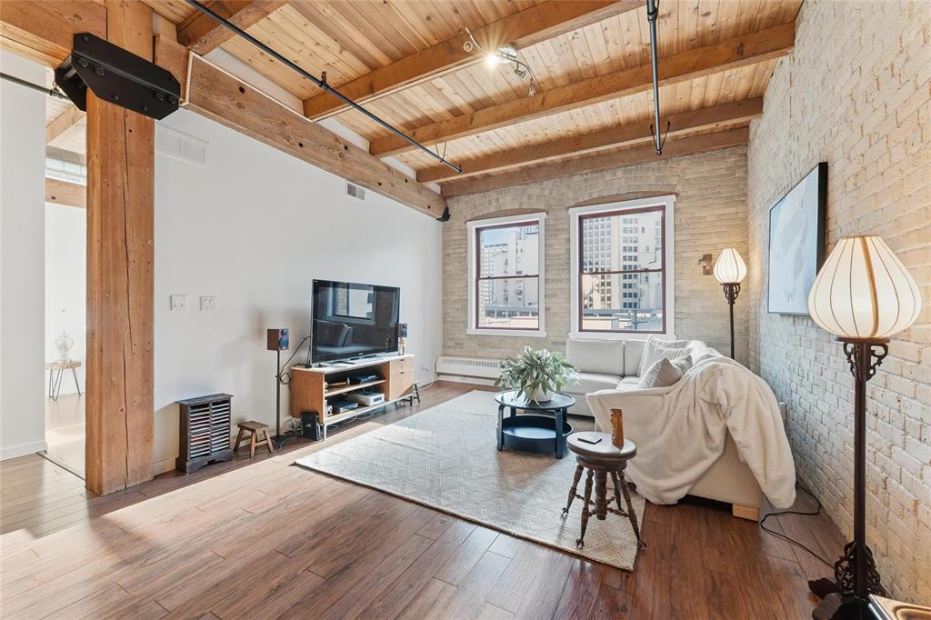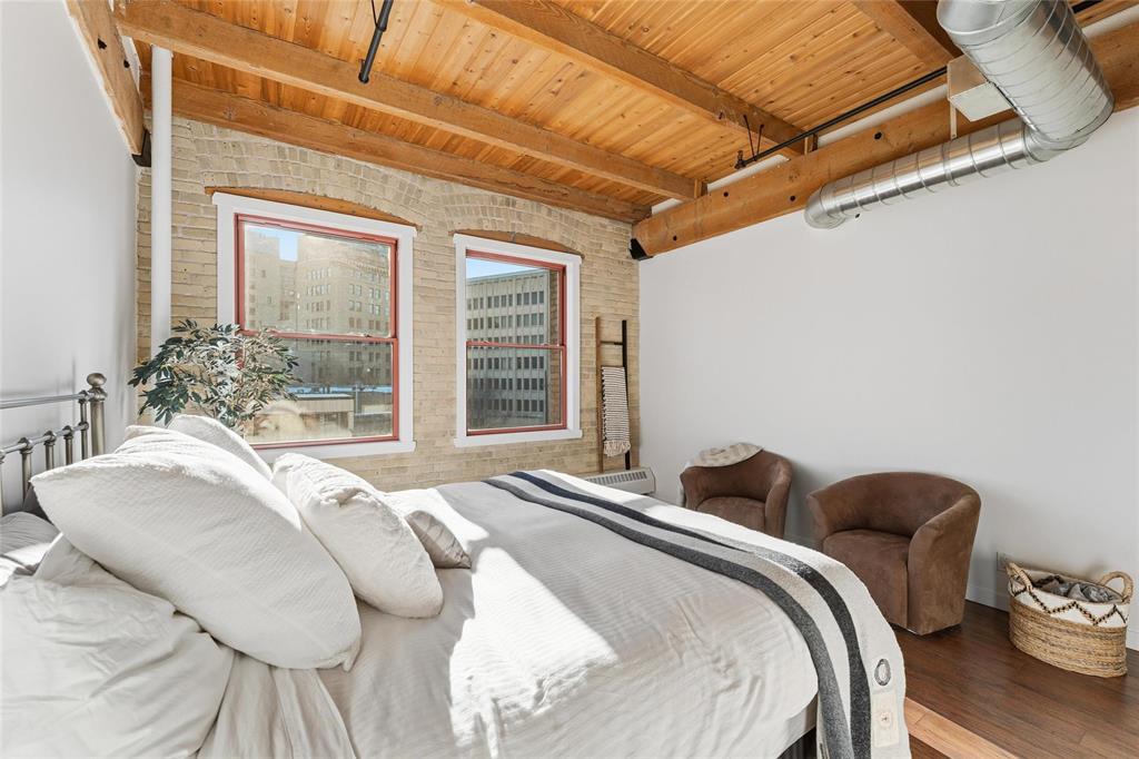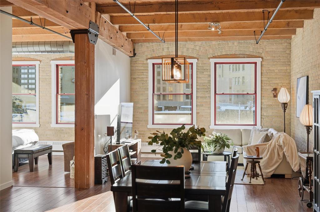 If you are looking for a luxury Loft,look no further! This expansive condo has almost 1800sq ft and will not disappoint!One of only 5 of the largest units out of 100 condos in the ever so popular Ashdown Warehouse!Located in the heart of the Exchange District this well established condo corporation has been here since 1987.South facing and absolutely flooded with light!! 4 extra large South facing windows with amazing downtown views let the sun shine in!Gorgeous walls of reclaimed brick!Beautiful upgrades throughout!Kitchen has been completely redone and expanded with tons of cabinet space and a huge Island with granite!Custom touches everywhere-coffee bar and a wine bar with wine fridge!Unique custom cedar ceiling for added aesthetic,additional sound barrier plus enhances the”Loft"feel and accentuates the massive Fir beams!The primary bedroom is bright and sunny with a walkthrough closet/closet systems leading to an ensuite bath*.Second extra large bedroom and full bath! Wood floors throughout! Oversized underground heated parking and heat included in condo fees!Pet friendly!This is one condo you need to come and see for yourself! Check out the video!!
