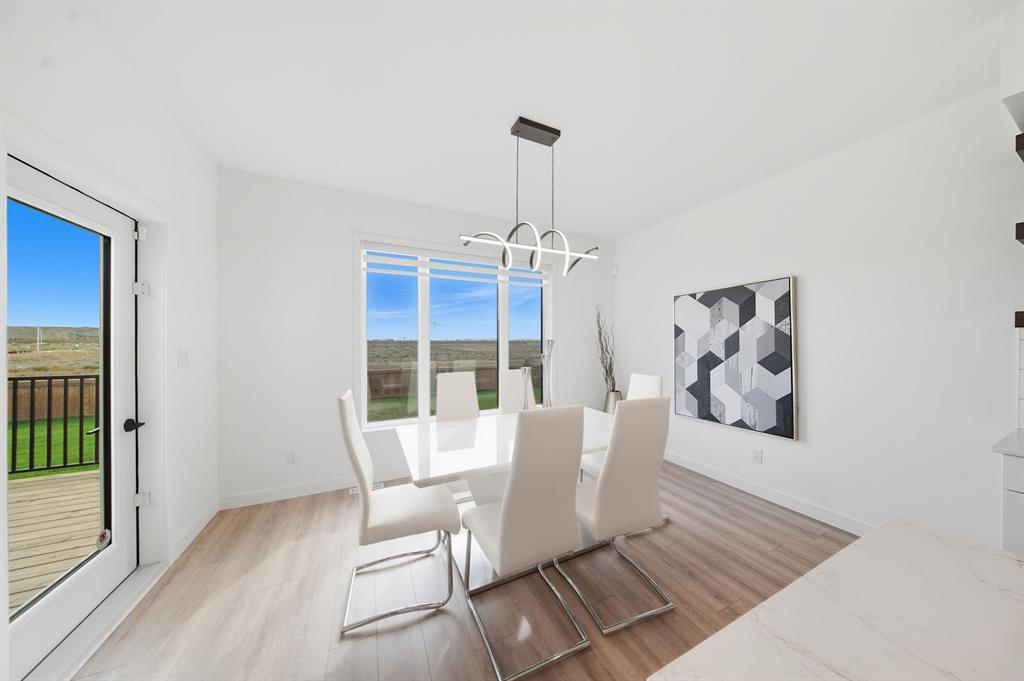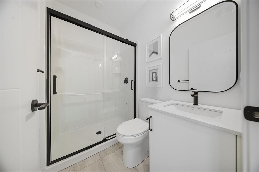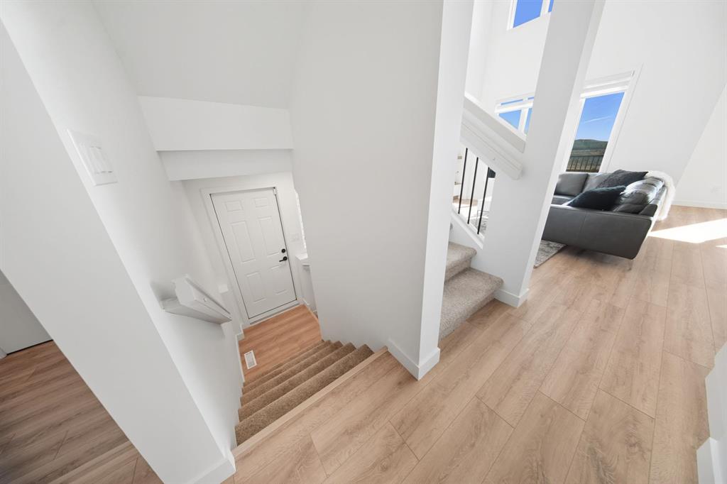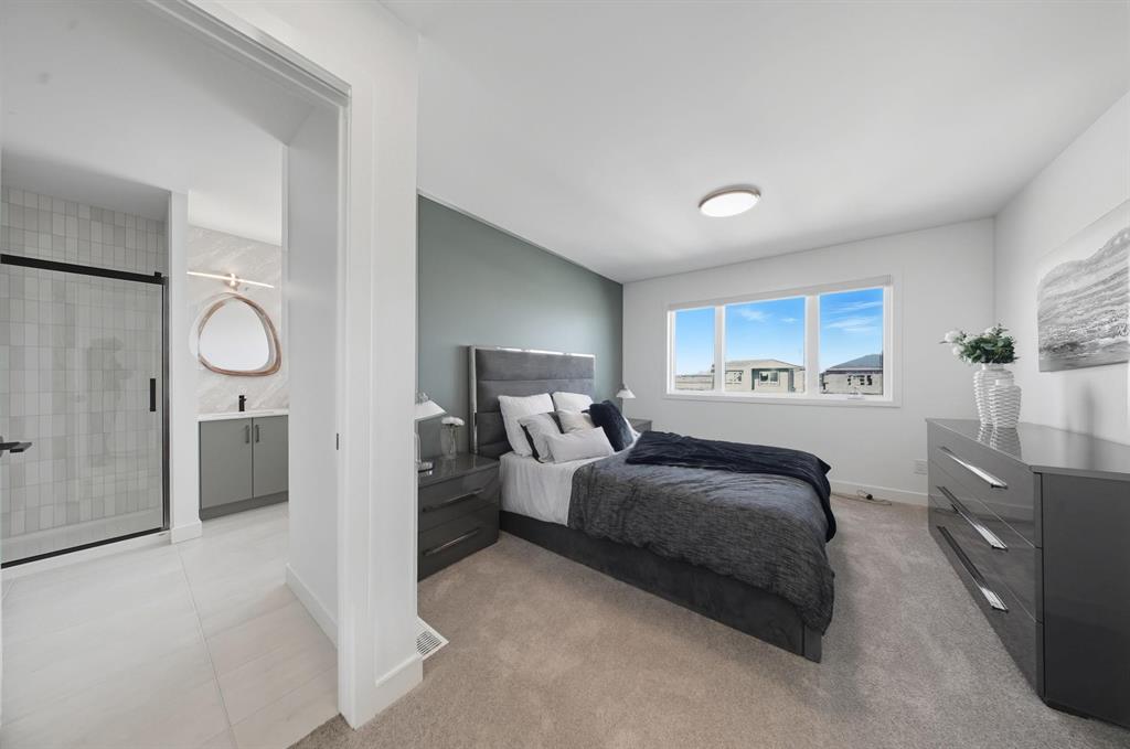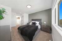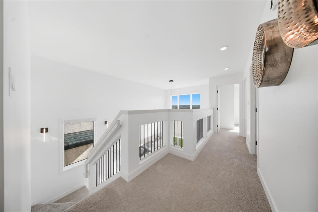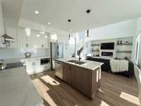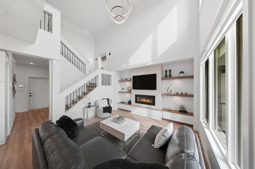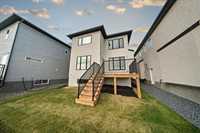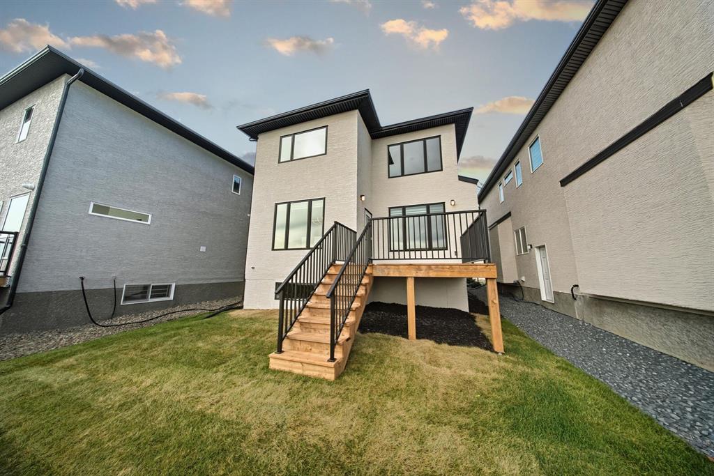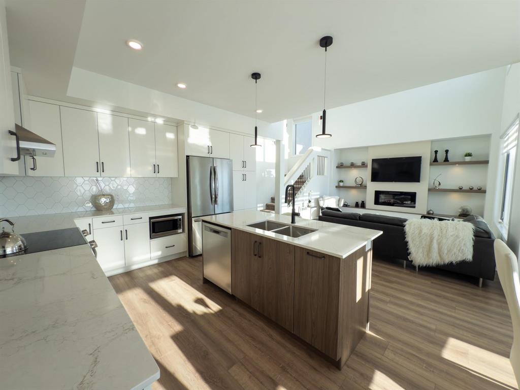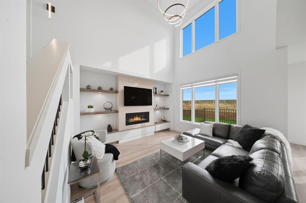 Welcome to Casa Moderna II from KDR Homes’ Casa Bella Collection. A two-storey home with open-to-below great room and modern functionality. This 1,684 sq. ft. home offers 4 bedrooms and 3 full bathrooms, including a main-floor bedroom with a full bath, ideal for guests or multigenerational living. Step into a spacious foyer that leads to an airy great room featuring soaring 18’ open-to-below ceilings, creating a bright, grand atmosphere filled with natural light from large windows throughout. The main level showcases a contemporary kitchen with thermo-foil cabinetry, an oak island, quartz countertops, and a tiled backsplash, complemented by an entertainment unit with electric fireplace and stylish designer lighting. Upstairs, the primary suite features a well-appointed ensuite with a tiled glass shower and double-sink vanity, while two additional bedrooms, a 4-piece bathroom, and a spacious laundry room complete the level. Additional highlights include a side entrance, 9’ basement ceiling height, a double attached garage, and a complementary deck with the basement ready for future development.