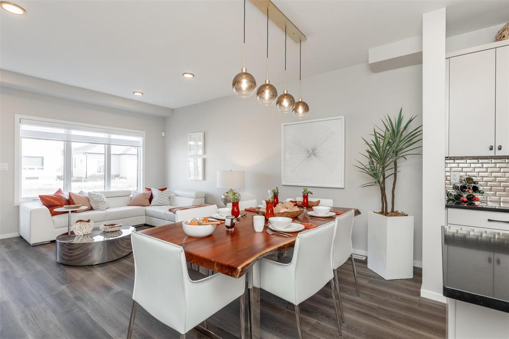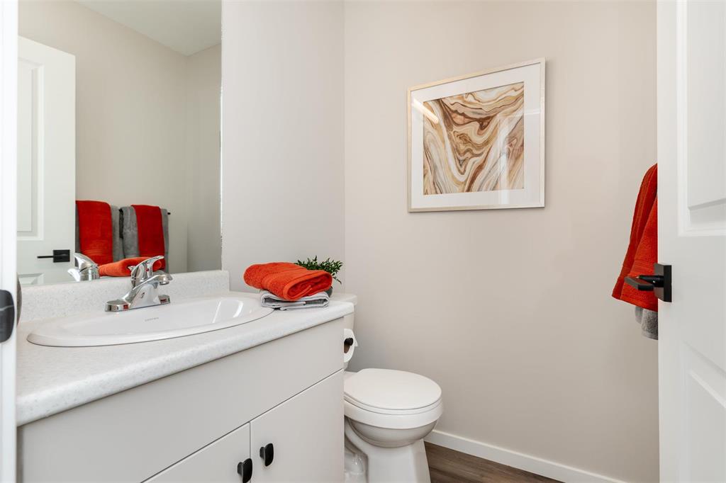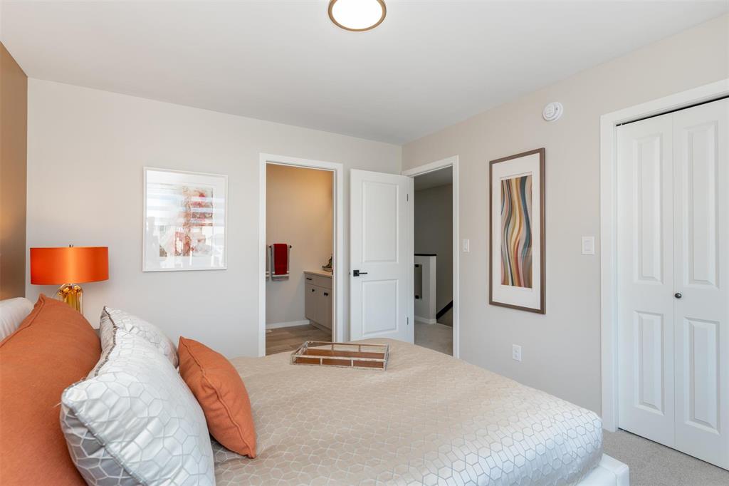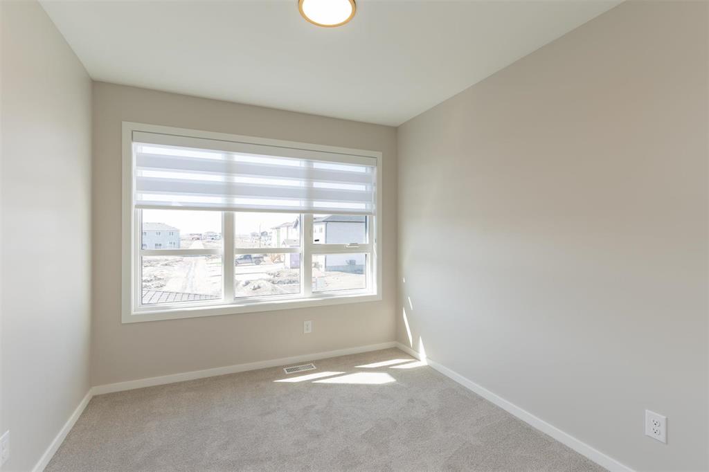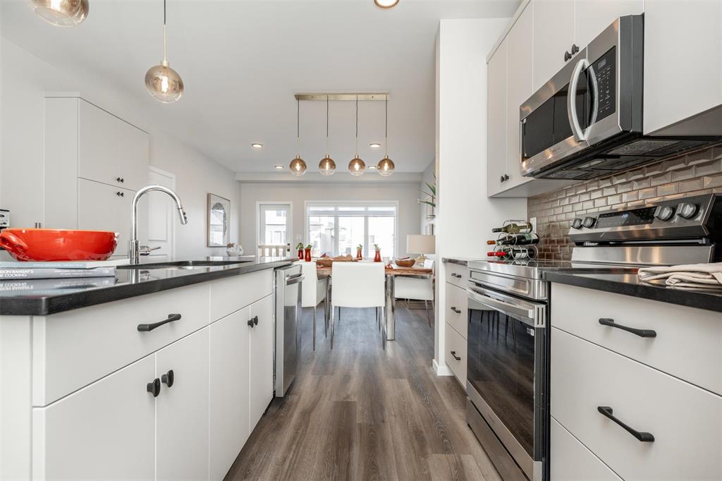 1400 Sq ft side by side showhome in Prairie Point with front drive to single attached garage and separate entry door to basement. Features plenty of upgrades and built to Efficiency Manitoba Specifications. This 3 bedroom home, has oversized windows, 9' main floor ceiling, a spacious kitchen with black quartz counters and double wall pantry with coffee bar! The Primary bedroom has a walk-in closet plus an ensuite bath with large vanity. The laundry is conveniently located on the second floor. Price includes central air conditioning, window coverings, kitchen appliances, main floor vinyl plank, alarm system, garage door opener, front yard landscaping and upgraded front exterior elevation.