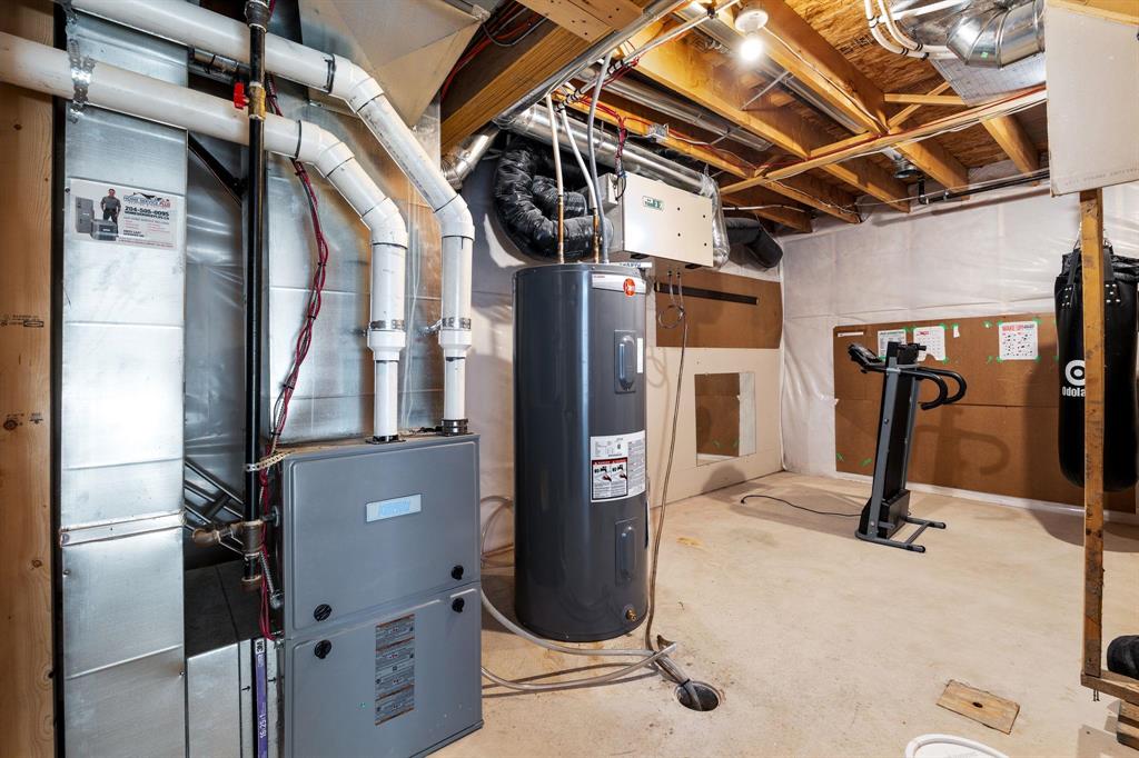 The basement is partially finished with framing and flooring completed, includes one bedroom (5 bedrooms total), a flex/office room with potential for a 6th bedroom, and rough-in plumbing for a future bathroom, plus additional space near the mechanical room for customization.