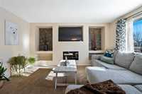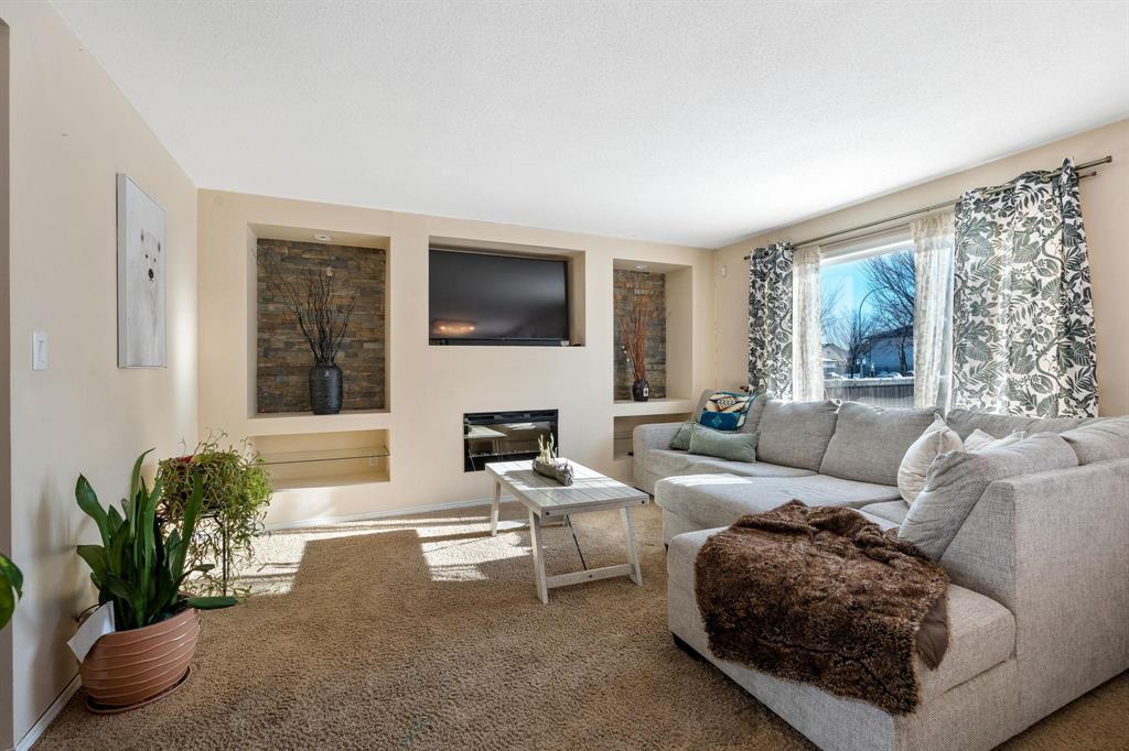 The bright main floor features great natural light, an open-concept kitchen, two living areas, and a beautiful built-in media unit with fireplace, along with a 2-piece powder room.