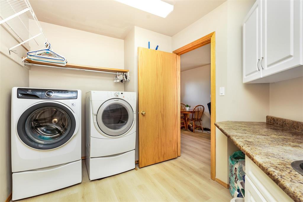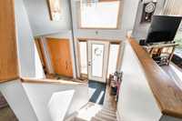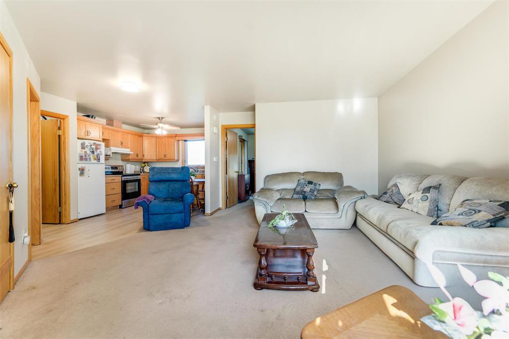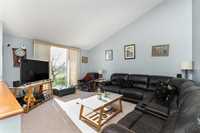 Inside the main residence, a bright two-storey foyer opens to expansive principal rooms with vaulted ceilings and sweeping views of the surrounding grounds. The main living area is warm and welcoming, perfect for gatherings or quiet evenings, with patio doors leading to a deck and manicured lawn. A well-placed laundry and mudroom add everyday practicality.