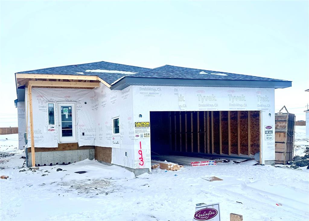 Spring Possession. This 1,409 sq. ft. bungalow is currently at the taping and painting stages, offers 3 bedrooms and 2 bathrooms with vaulted ceilings in the main living areas and a charming covered front porch. A spacious foyer with closet welcomes you inside, along with a mudroom entry from the garage and convenient main-floor laundry. The open-concept layout features a Great Room, dining area, and a beautifully designed kitchen with custom cabinetry, Caesarstone quartz countertops, tiled backsplash, wall pantry, and island. The primary bedroom includes a private ensuite with a stand-up shower and a walk-in closet. Bathrooms are finished with cultured marble countertops, while additional highlights include soft-close cabinetry, laminate flooring for a clean, modern look, flat painted ceilings, double attached garage, concrete driveway and sidewalk, and a piled foundation. This home is backed by the 1-2-5-10 Year New Home Warranty Program.