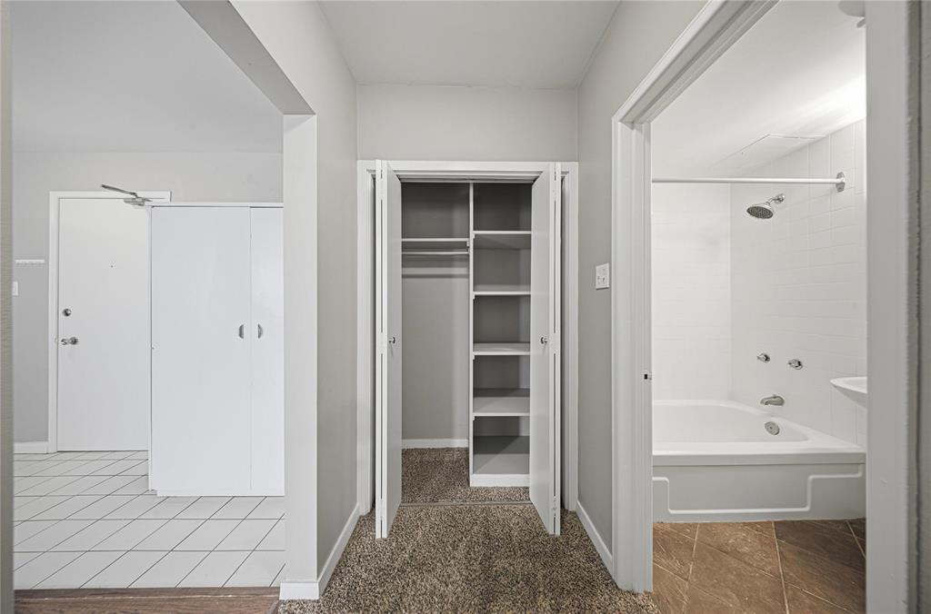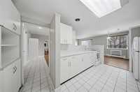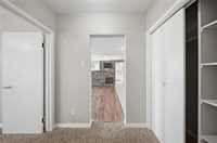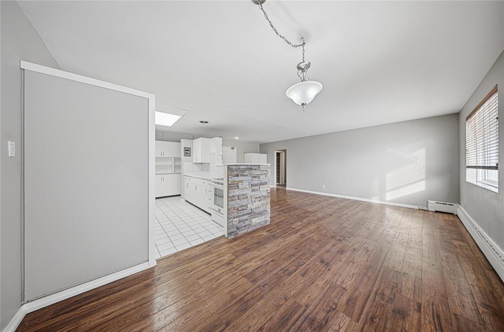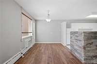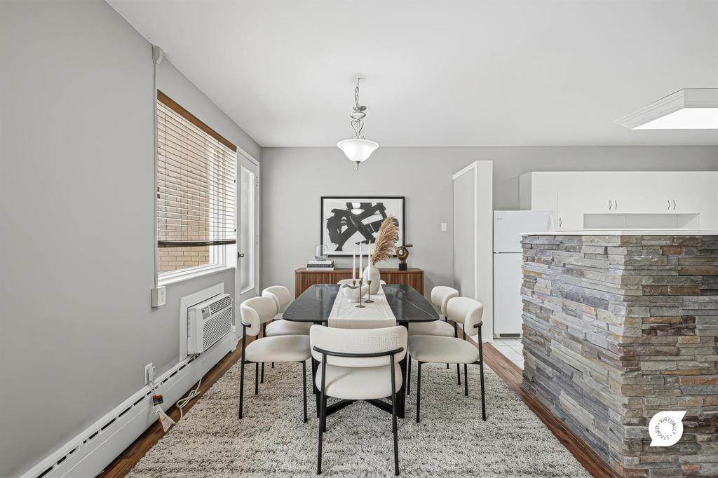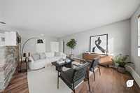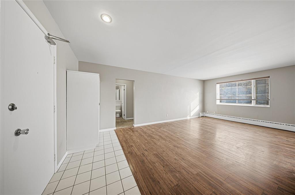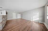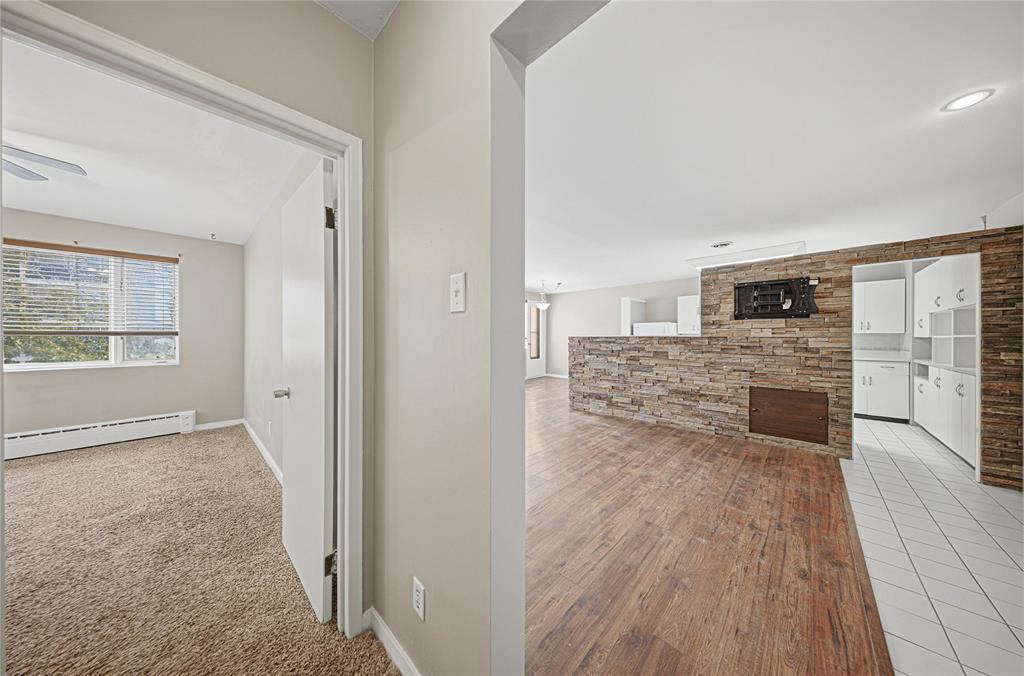A stone feature wall subtly separates the kitchen from the main living space, offering visual definition while keeping an open feel. The unit features a generous bedroom, large closet, and updated flooring in key areas. Fresh, neutral tones throughout make it move-in ready or easy to customize.