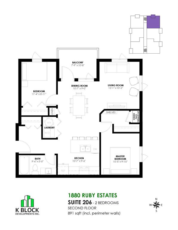 This 2 bedroom corner suite features a galley style kitchen with large island overlooking the large dining room, a corner living area room, and primary bedroom with walk- closet.