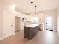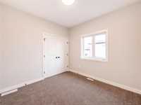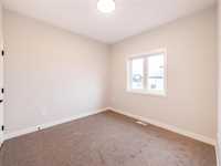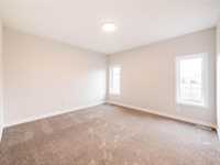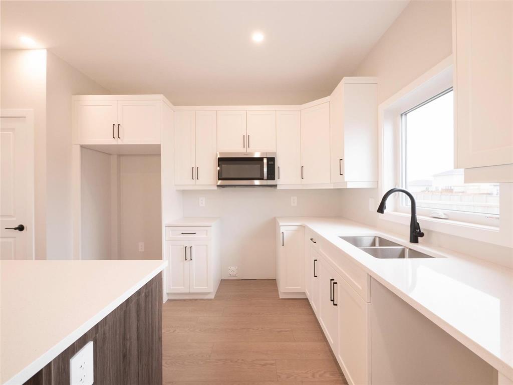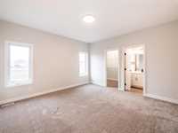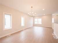 1,392 sq ft bungalow with 9 ft ceilings, quartz countertops, big island + soft-close custom cabinets. 3 bedrooms incl primary with walk-in + ensuite, plus double attached garage. South-facing yard with green space behind!