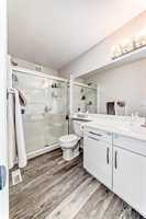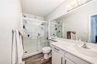 Upstairs offers 3 spacious bedrooms including primary suite with large walk-in closet and private 3-piece ensuite with 5’ glass walk-in shower. Two additional bedrooms share a 4-piece bath. Upper-level laundry with linen shelving.