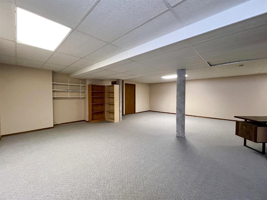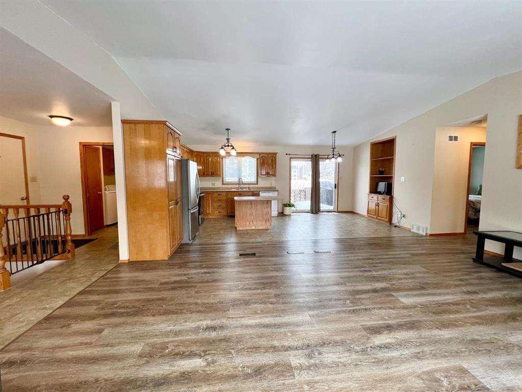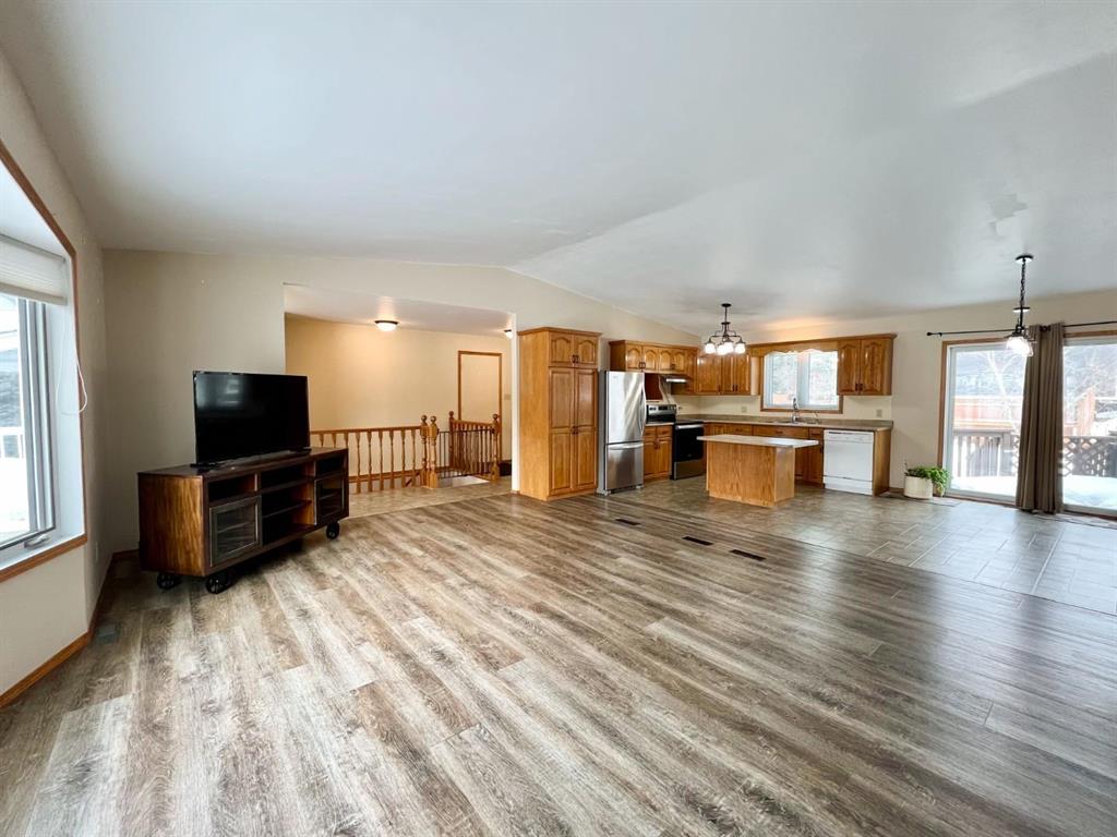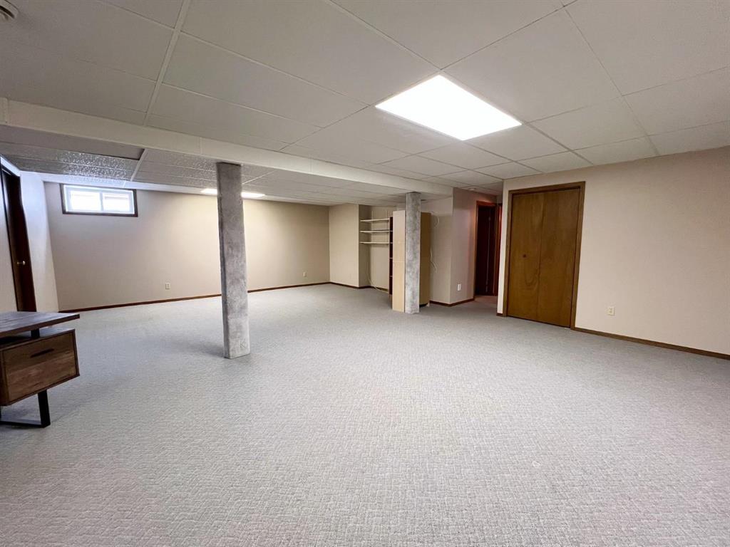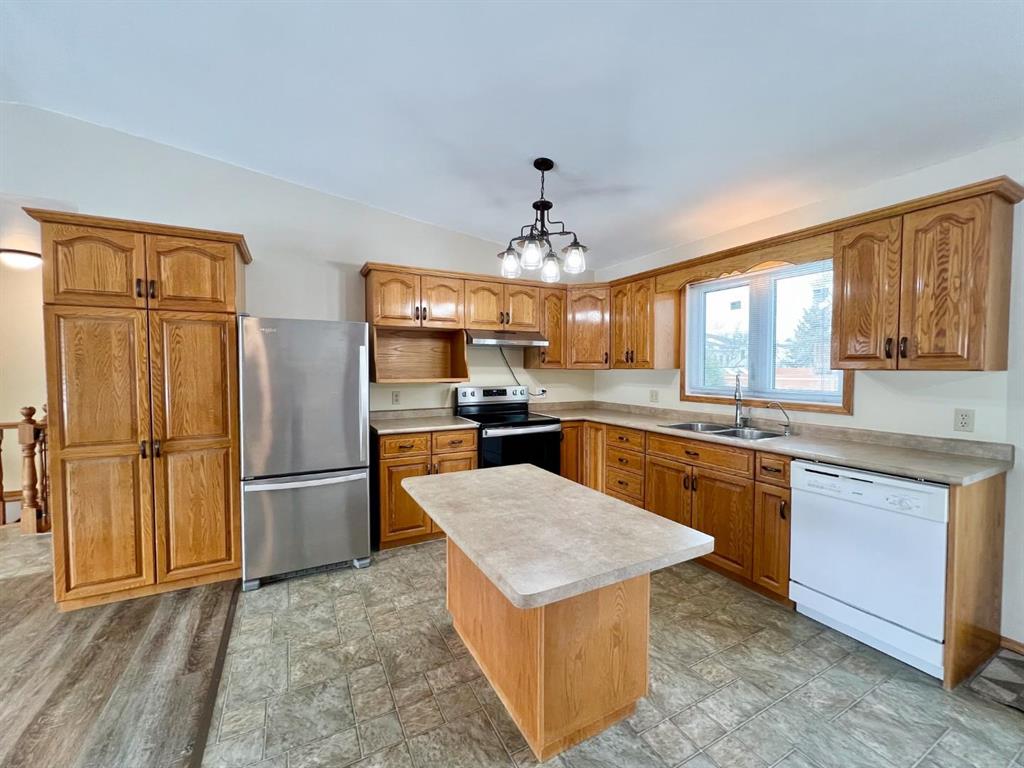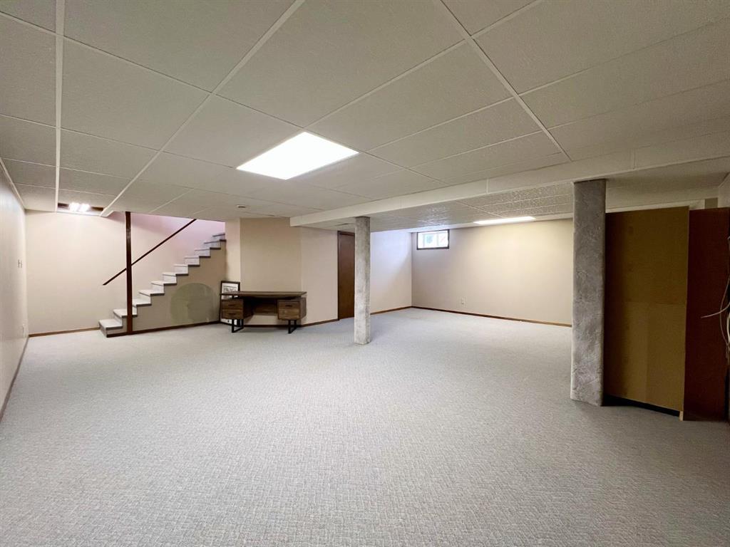 Welcome to this open-concept 1,262 sq ft bungalow situated on a large corner lot. The main floor offers two comfortable bedrooms, convenient main-floor laundry, and two full bathrooms. The bright kitchen, dining, and living areas create an inviting space for everyday living and entertaining. The fully finished basement features a spacious family room, two additional bedrooms, and a three-piece bathroom—ideal for growing families or guests. An oversized, insulated double garage provides ample room for vehicles, storage, or a workshop and includes built-in storage and paved driveway. A two-tier deck off the dining room, perfect for enjoying the outdoors. Recent updates include new windows in the kitchen, main-floor bedrooms, and bathroom, as well as a new steel entry door. Additional upgrades include a newer air conditioner, fridge, stove, and washing machine. A well-maintained home offering space, functionality, and comfort inside and out.
