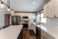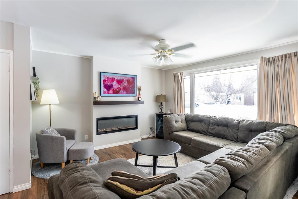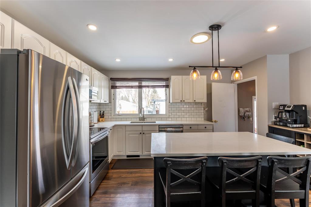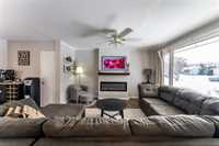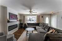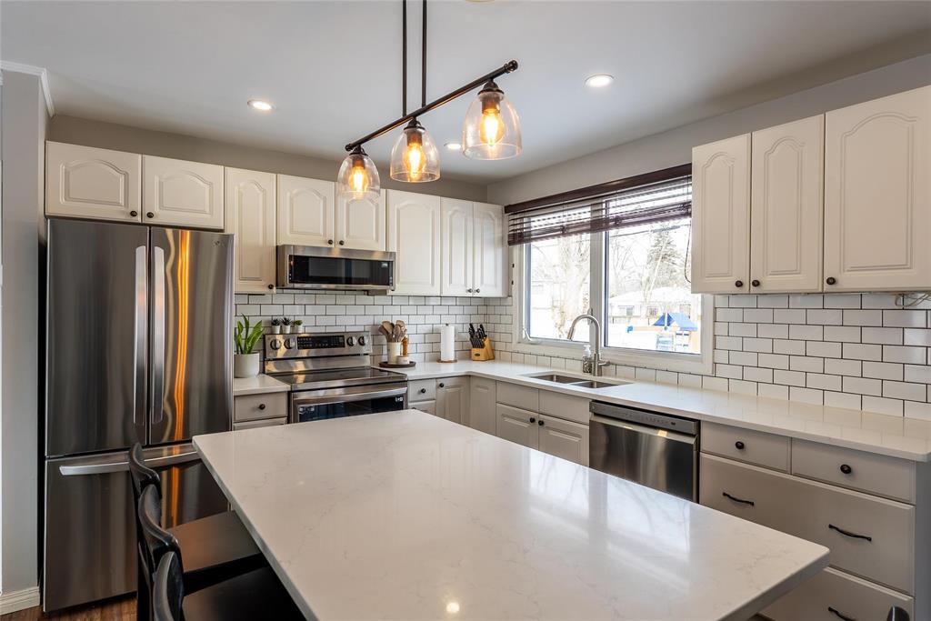 Discover this well-appointed, upgraded home featuring three bedrooms and two bathrooms, plus a finished lower level with a rec room, home gym, and potential fourth bedroom/office. The recently remodelled kitchen boasts an island with granite countertops. Set on a fenced lot, the property includes an oversized two-car garage (24'W x 22'L), which is insulated, heated, equipped with a pellet stove, and powered by 220 amps. The living room features a newer PVC window and an electric fireplace, while the primary bedroom comfortably accommodates a king-size bed. The fully fenced backyard highlights a newer interlocking stone patio. Additional upgrades include:• Shingles from 2015• Upgraded attic insulation• 2-year-old kitchen appliances• Furnace (2021)• Hot water tank (2023)• Air conditioning (2023)• A newer sump pump