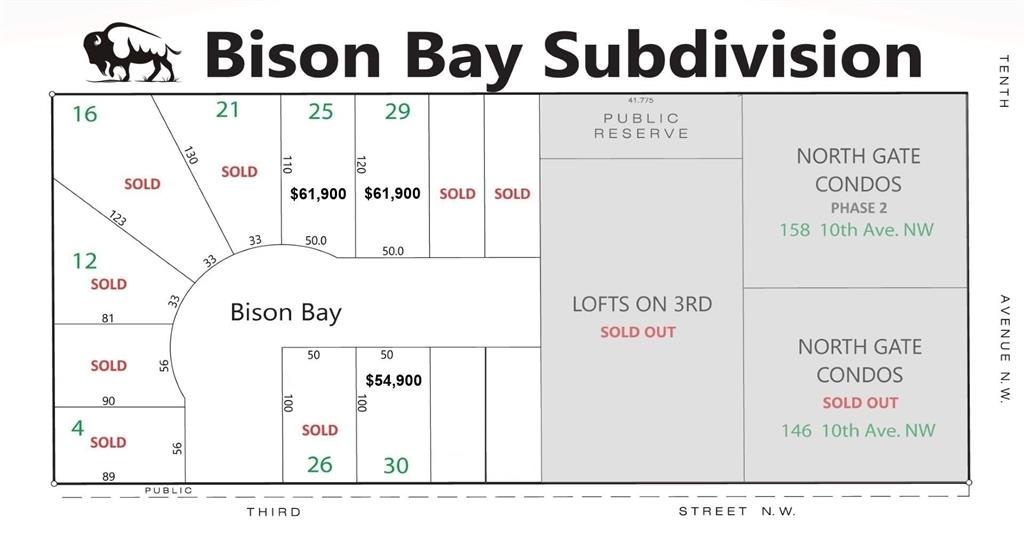 Bison Bay features established trees, natural gas availability and is conveniently located near walking paths, the recreation centre, skate park, community gardens, Centennial Park, schools and downtown shopping. Contact your agent for more information and to reserve your lot!