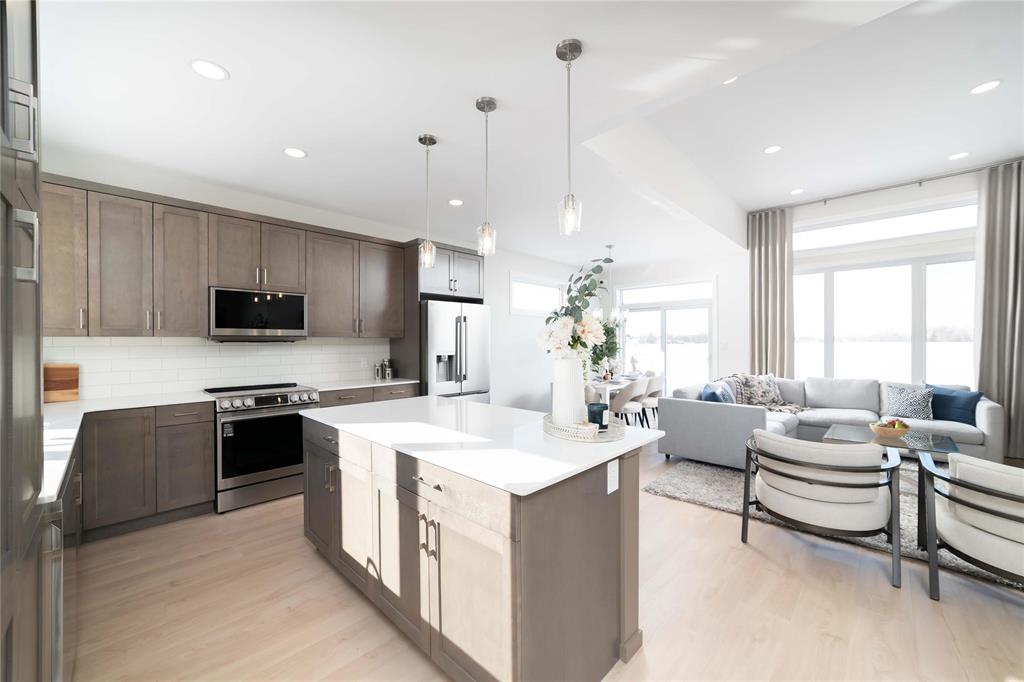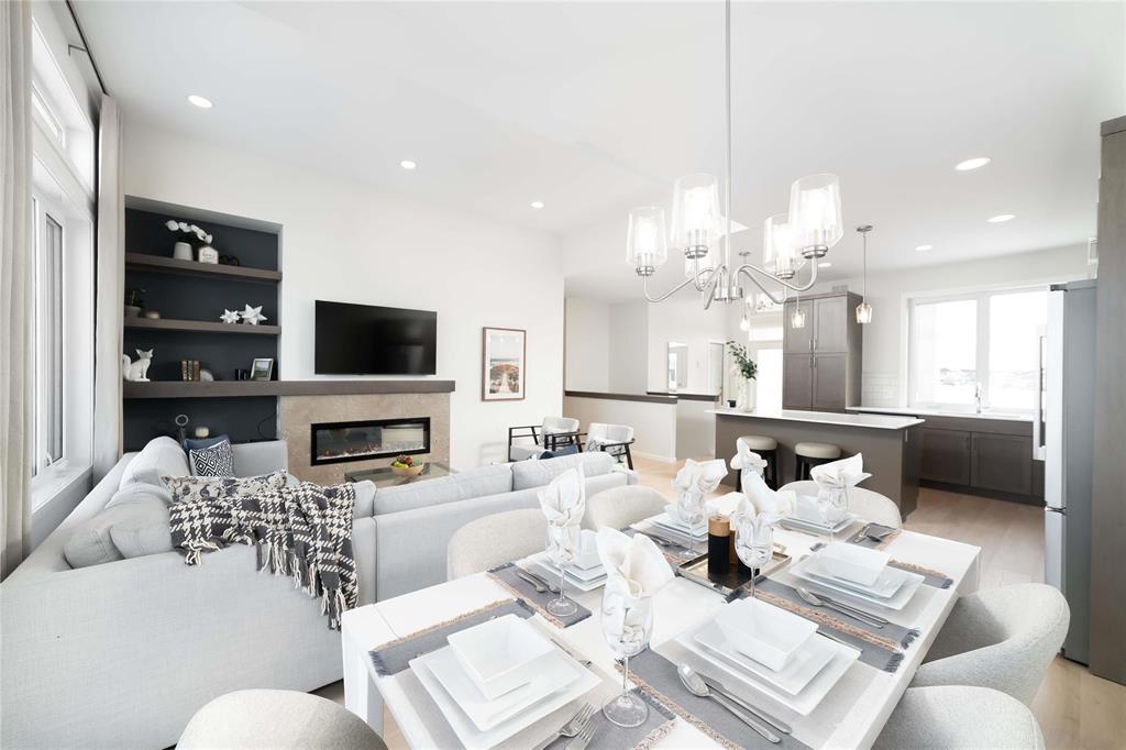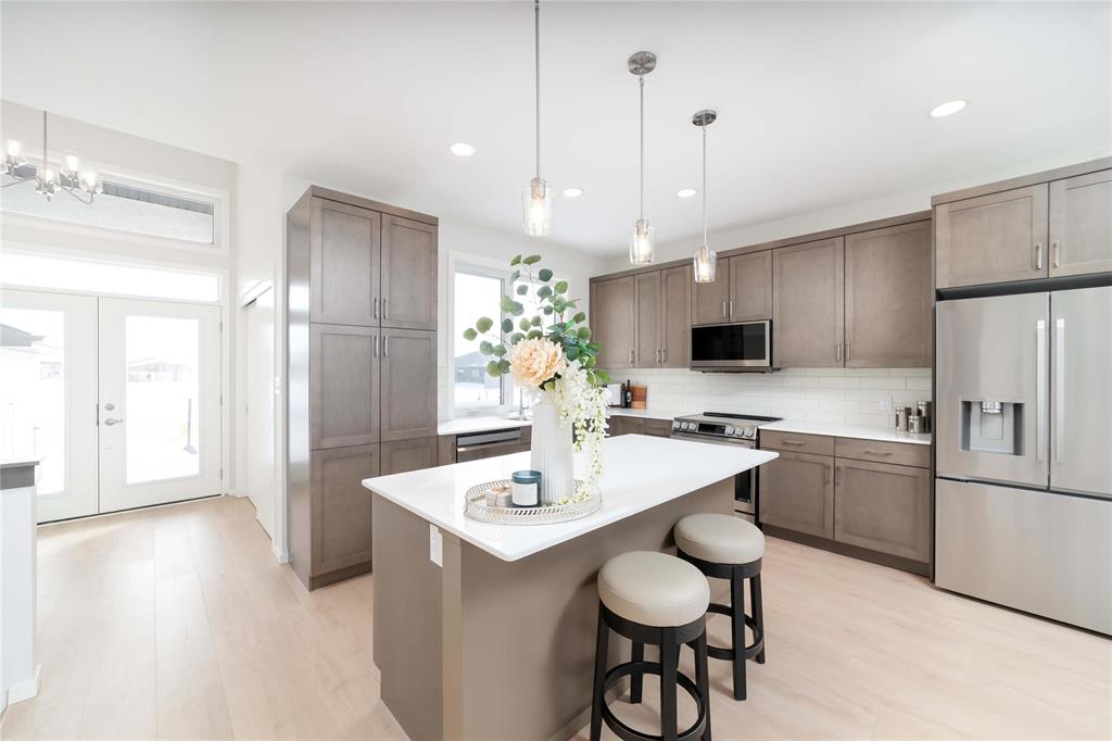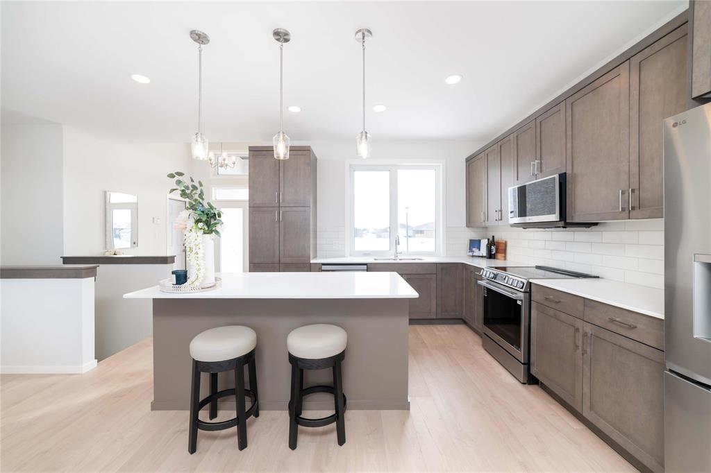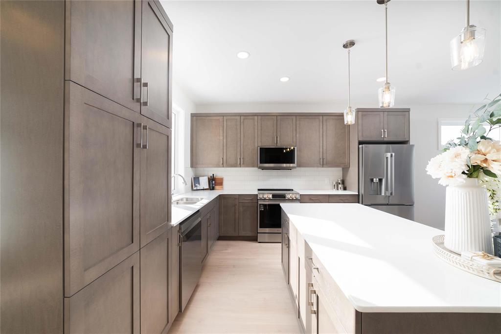 SHOW HOME FOR SALE: At 1427sf, this A&S Homes bungalow plan offers a spacious yet cozy design, with 11' ceilings & exceptional details inside & out. The deluxe kitchen features a large island, quartz counters, front facing window and an abundance of cabinetry & counter space. The open concept layout allows your new KT to flow seamlessly into the dining & great room areas, making it the perfect space for entertaining or simply relaxing with family. The great room centers around an elegant tile facing fireplace w/built-in shelves. And the dining area has large patio doors that lead to a spacious two tier deck. Upgraded lighting and beautiful laminate floors throughout most of the main floor areas. The primary BR is a private retreat, with walk-in closet & ensuite highlighted by the 5' shower and tiled floor. A full laundry room, a second full bath, and two additional BR's complete this inspired design. The exterior stands out with enhanced stone & wood siding details. Oversized (22'x24') garage w/full concrete driveway, sidewalk and front steps. Fully landscaped, front and back. Show Home open Sat & Sun, 12:00 noon to 5 pm, or call to book your private viewing.