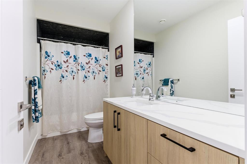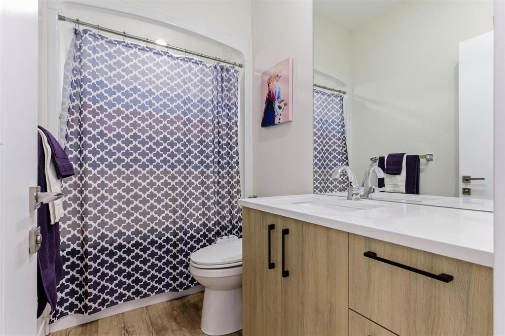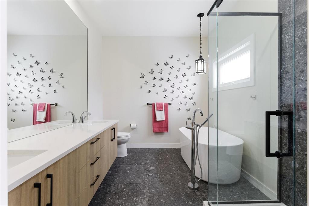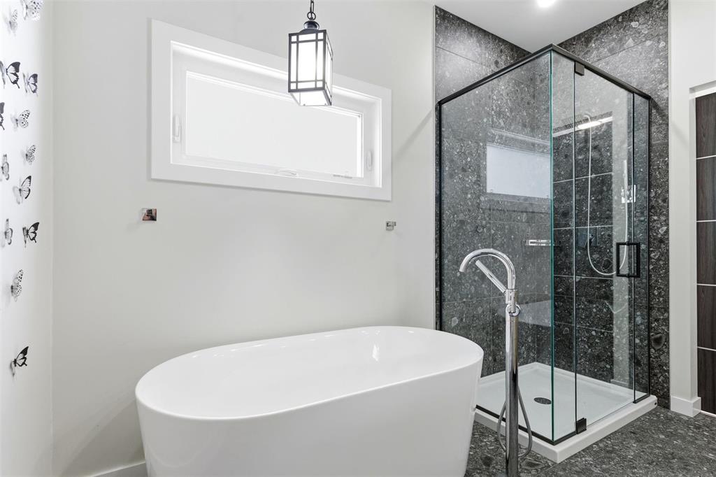 Three main-floor bedrooms include a spacious primary retreat with walk-in closet and a spa-style ensuite featuring a freestanding tub and glass shower. A full guest bath completes the level.