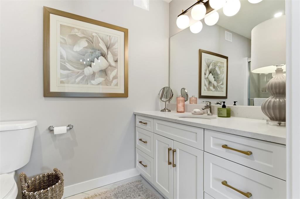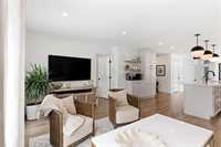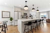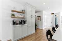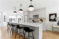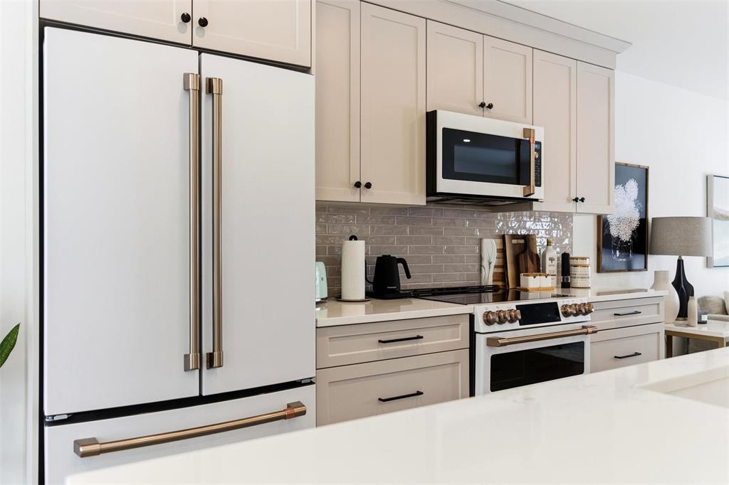 This beautifully crafted 2-bedroom plus den home was custom built for its original owner and showcases intentional design at every turn. From the moment you enter, the attention to detail is evident — upgraded vinyl plank flooring, elevated cabinetry, quartz countertops, and a generous island that anchors the kitchen space and Cafe appliances. A thoughtfully designed coffee station sits neatly beside the oversized pantry, blending convenience with style.