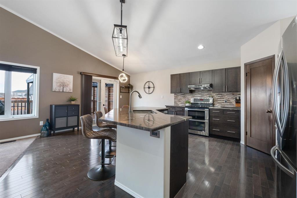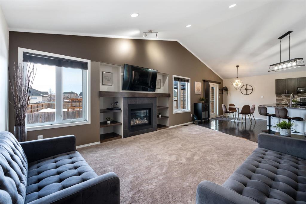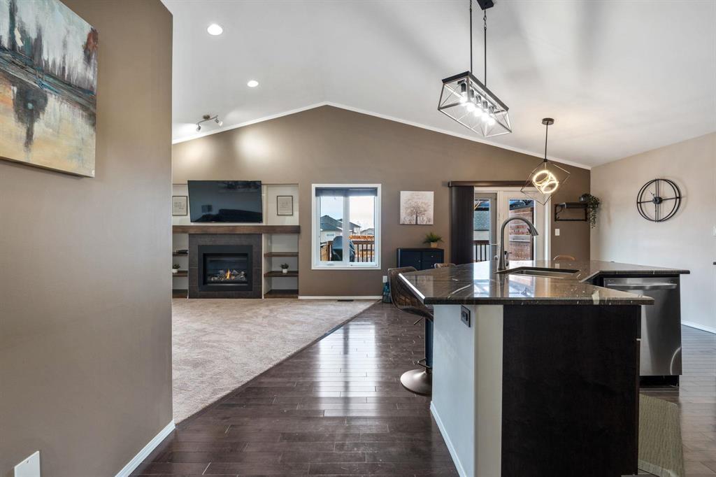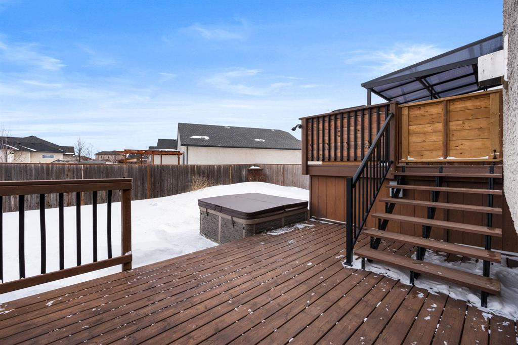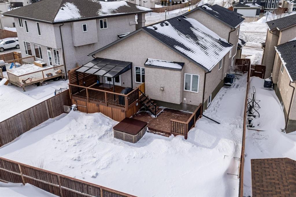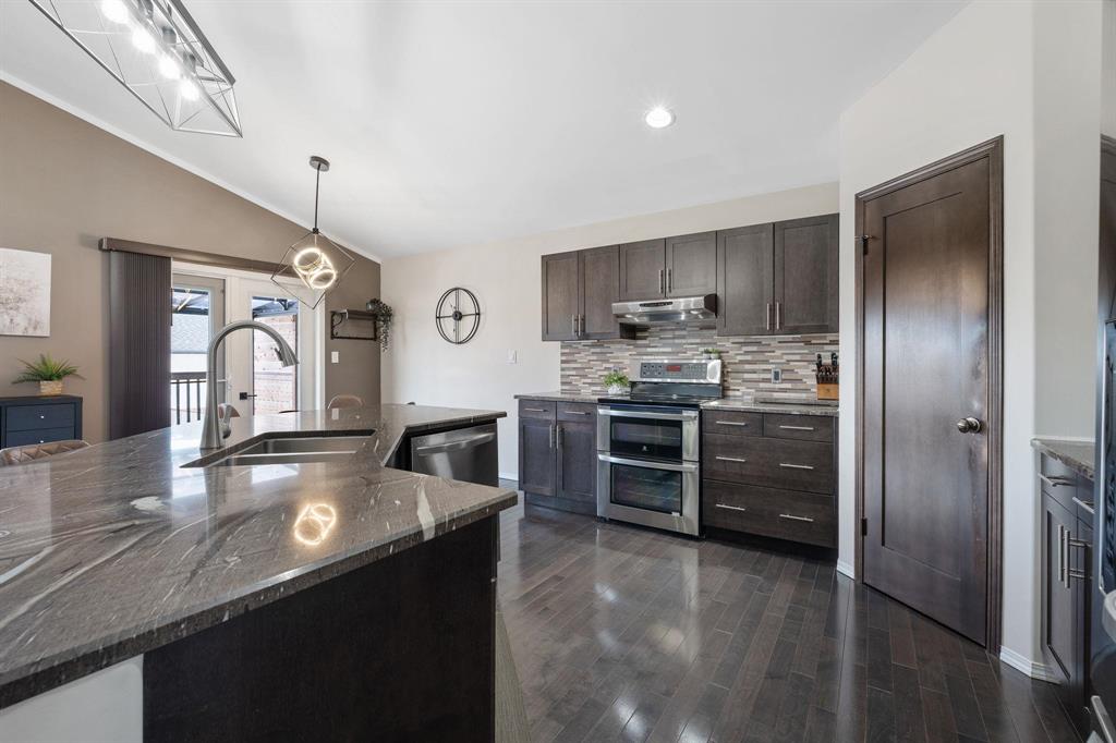 Showings start Thurs, March 5. Open House Sun, March 8 from 1–3 PM. Offers Tues, March 10 at 3 PM. Absolutely stunning 5-bedroom cab-over on a gorgeous pie-shaped lot in a highly sought-after area close to all major amenities. Pride of ownership is evident from the moment you arrive. Spacious front foyer with garage access leads to a bright main floor featuring a large flex room (dining or sitting area), two generous bedrooms and a full bath. The massive eat-in kitchen offers an enormous island, granite countertops, hardwood floors, vaulted ceilings, abundant cabinetry and large pantry, all overlooking the great room with built-in wall unit and gas fireplace. Step outside to the beautiful two-tier deck with pergola and hot tub (new cover) and enjoy the fully fenced, meticulously landscaped yard. Upstairs features a huge primary with separate AC system, walk-in closet and ensuite with soaker tub. The beautifully finished basement includes a large rec room (projector and theatre system included), two bedrooms, 2-piece bath with shower rough-in and spacious utility room. Finished garage, shingles 2025, 200 amp, H20 tank 2023, high-end appliances including double oven and new washer. Shows A+++!