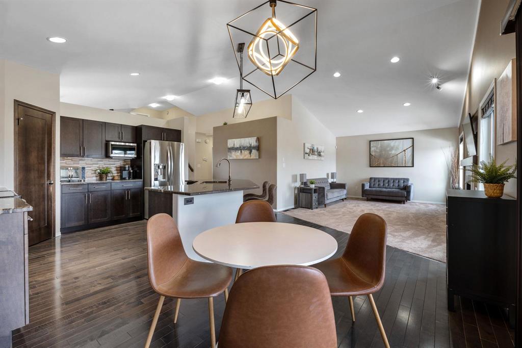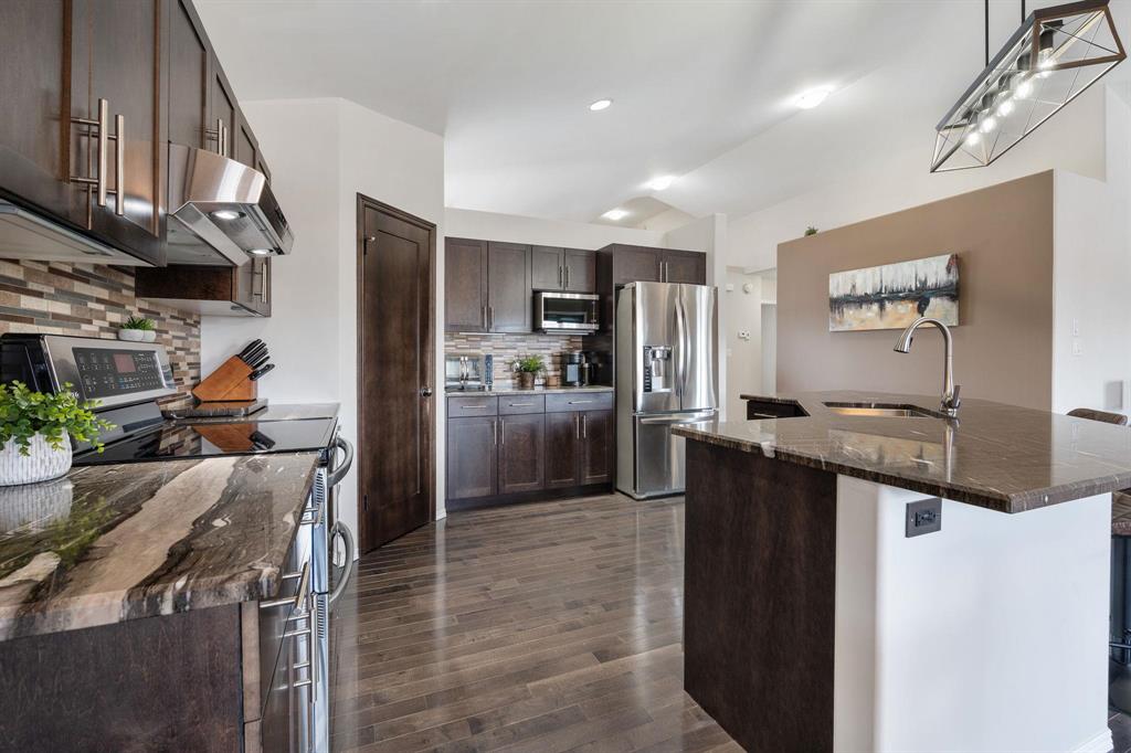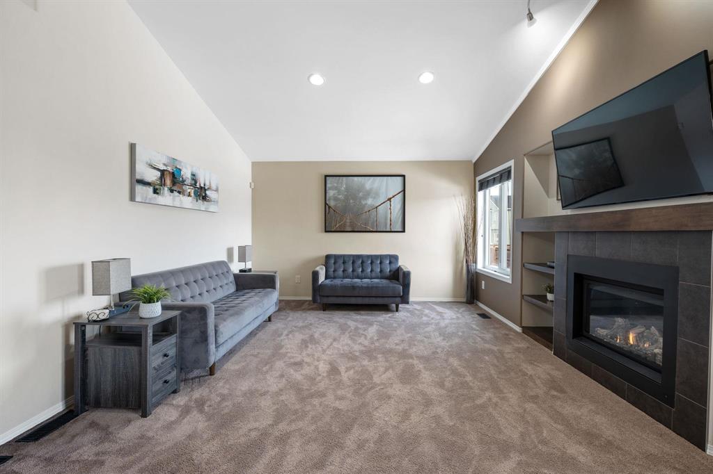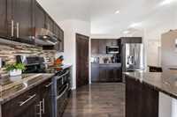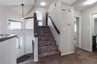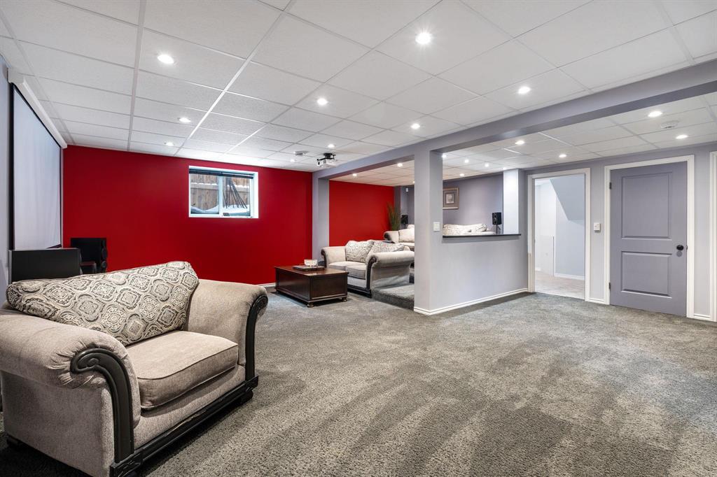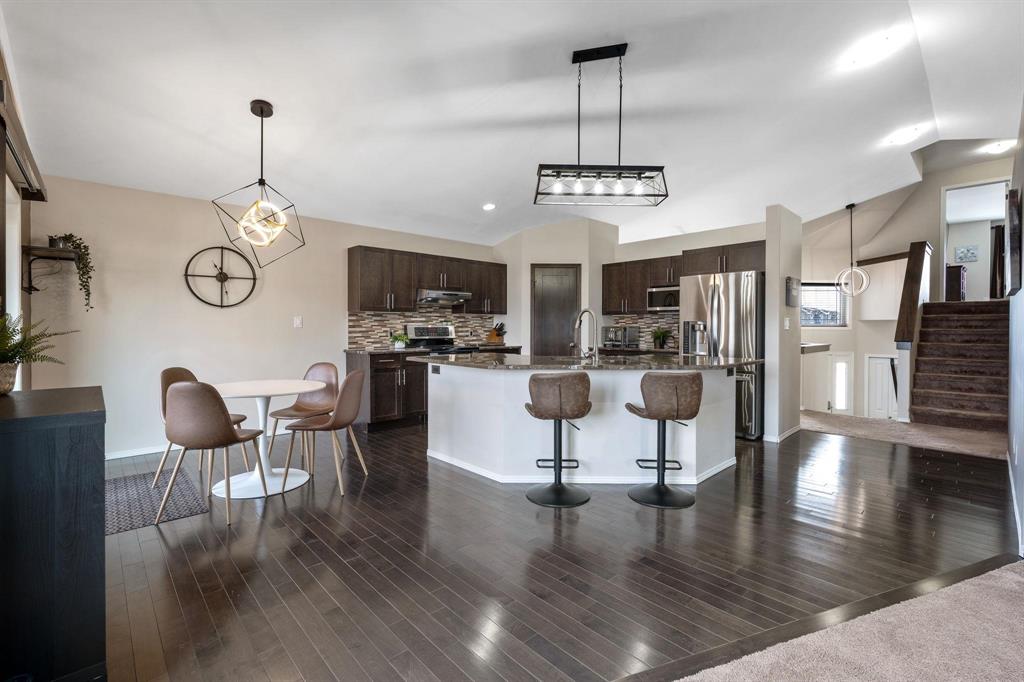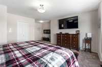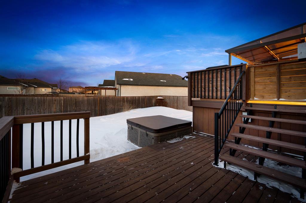 Showings start Thurs, March 5. Open House Sun, March 8 from 1–3 PM. Offers Tues, March 10 at 3 PM. Absolutely stunning 5-bedroom cab-over on a gorgeous pie-shaped lot in a highly sought-after area close to all major amenities. Pride of ownership is evident from the moment you arrive. Spacious front foyer with garage access leads to a bright main floor featuring a large flex room (dining or sitting area), two generous bedrooms and a full bath. The massive eat-in kitchen offers an enormous island, granite countertops, hardwood floors, vaulted ceilings, abundant cabinetry and large pantry, all overlooking the great room with built-in wall unit and gas fireplace. Step outside to the beautiful two-tier deck with pergola and hot tub (new cover) and enjoy the fully fenced, meticulously landscaped yard. Upstairs features a huge primary with separate AC system, walk-in closet and ensuite with soaker tub. The beautifully finished basement includes a large rec room (projector and theatre system included), two bedrooms, 2-piece bath with shower rough-in and spacious utility room. Finished garage, shingles 2025, 200 amp, H20 tank 2023, high-end appliances including double oven and new washer. Shows A+++!
