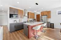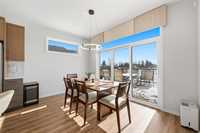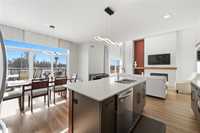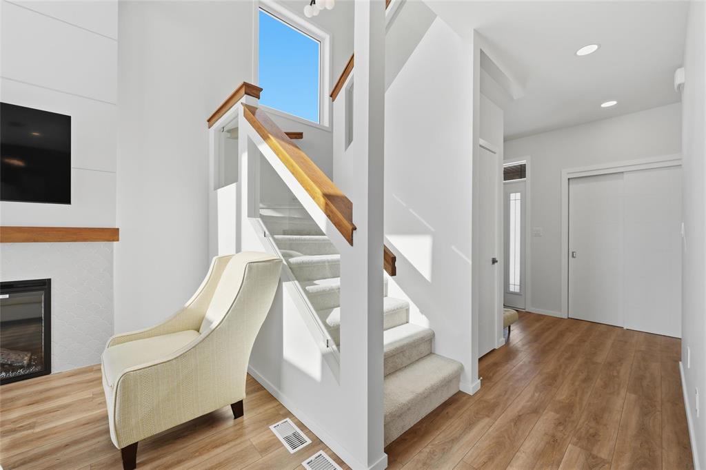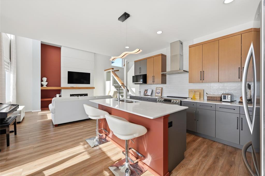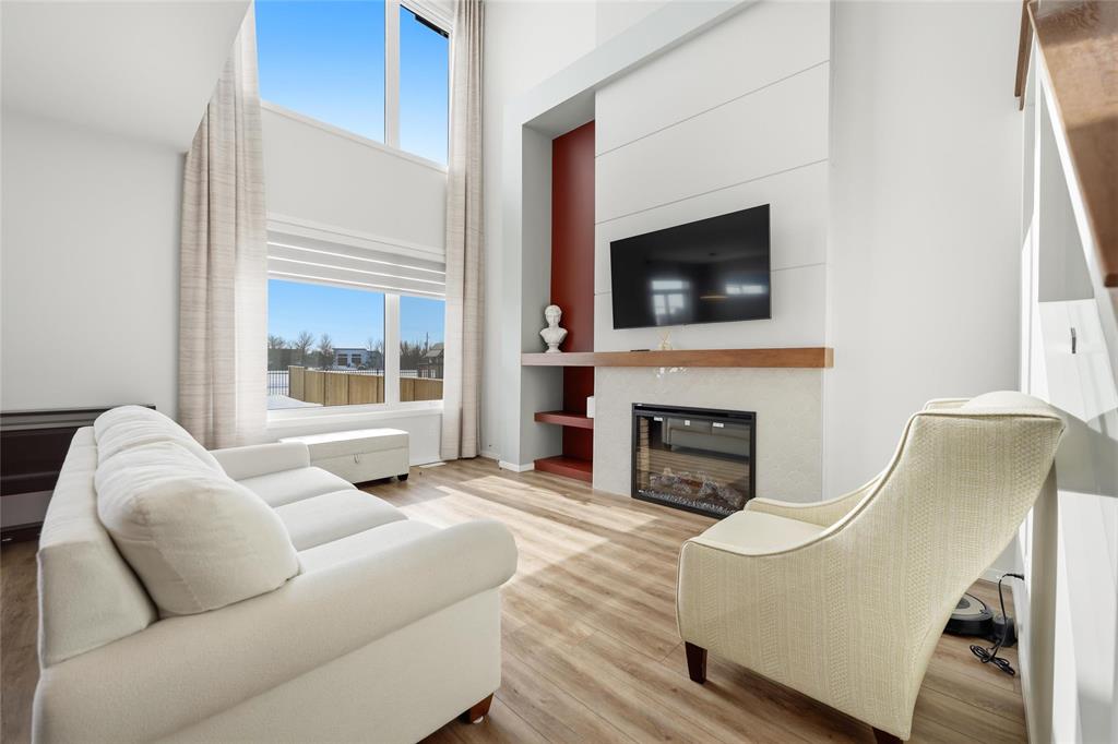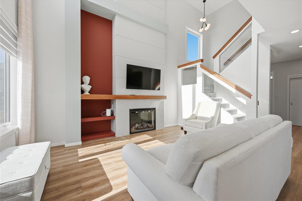 The grand living room features an oversized Napoleon fireplace — a stunning focal point for both relaxing and entertaining. The open-concept layout flows into a chef-inspired kitchen complete with premium stainless steel appliances, sleek cabinetry, &elevated finishes designed for style and performance.