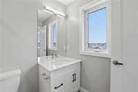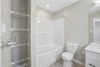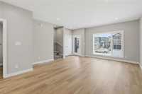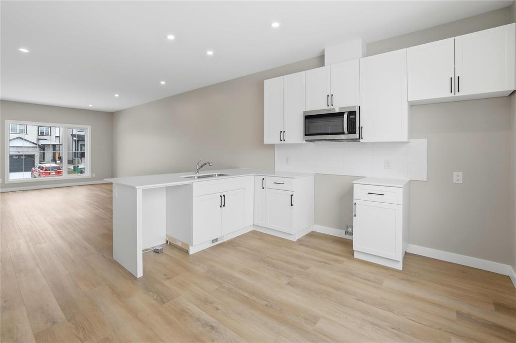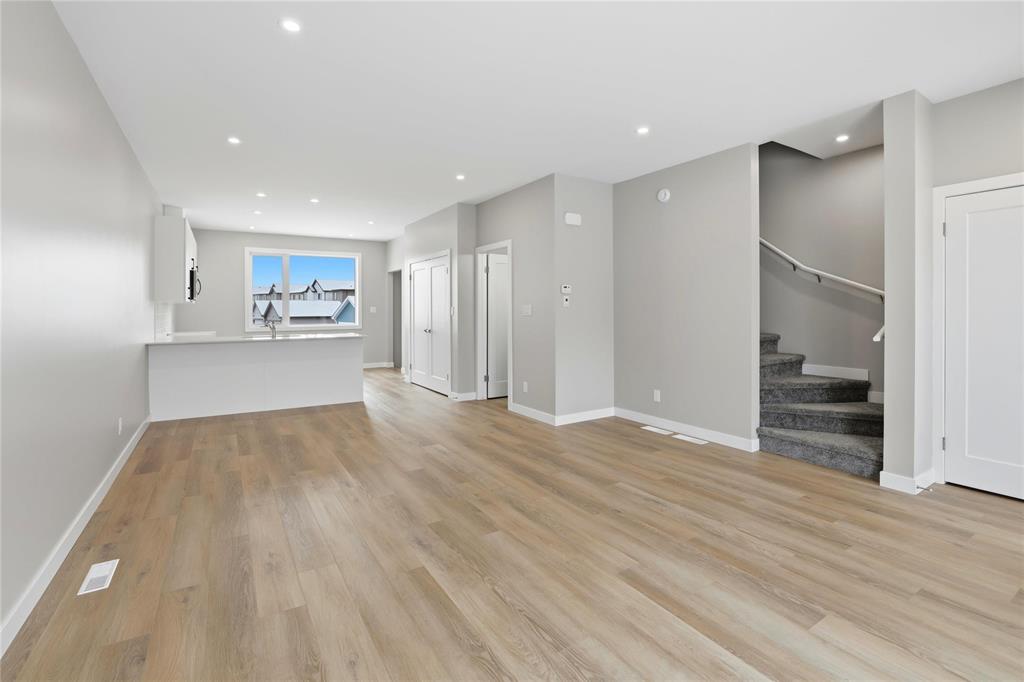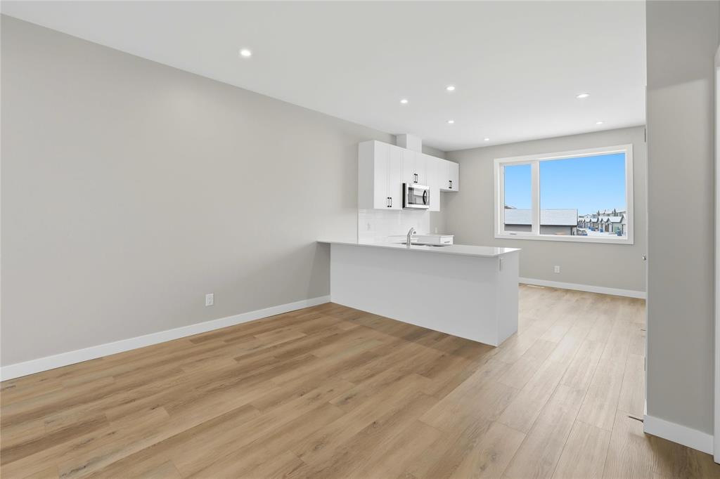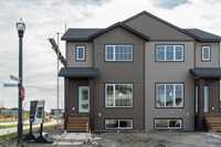 Quality-constructed single-family attached home in Aurora at North Point. First-time home buyers may be eligible for the 5% GST rebate, offering significant upfront savings. Please note: listing photos are from a similar build; finishes will vary. This well-designed 3-bedroom, 2.5-bathroom home features an open-concept layout with 9-foot ceilings, large windows, and light-wood luxury vinyl plank flooring throughout the main living area. The kitchen will feature warm wood-tone cabinetry with modern black hardware, a tile backsplash, and a peninsula with breakfast bar seating, ideal for everyday living and entertaining. Upstairs includes a spacious primary bedroom with a walk-in closet and a 4-piece ensuite, along with two additional bedrooms and a full bath. Constructed with an engineered web truss floor system and backed by a 5-year new home warranty. Concrete front walkway and double parking pad included. Located close to walking trails, parks, and the new K–8 school. Spec sheet and floor plans available upon request.