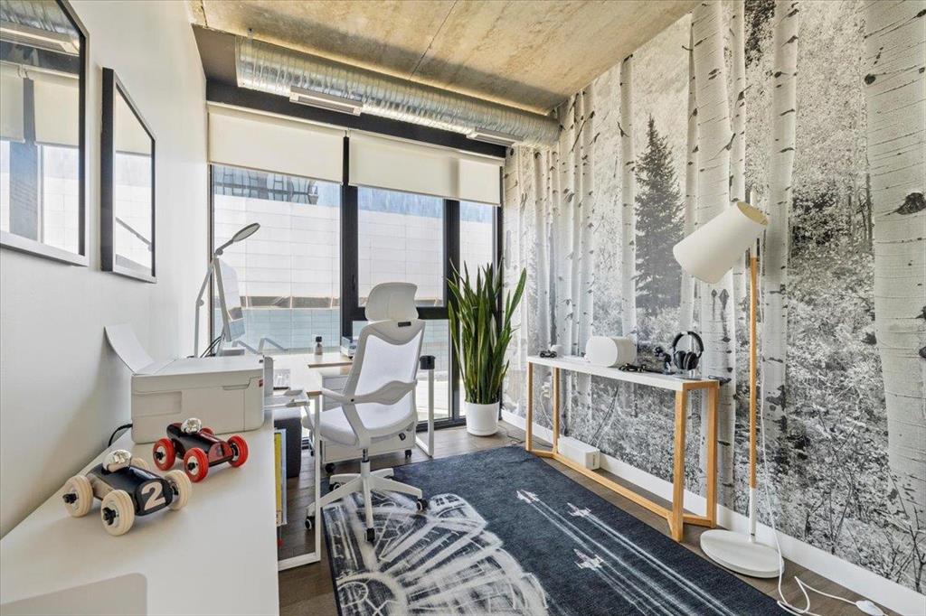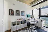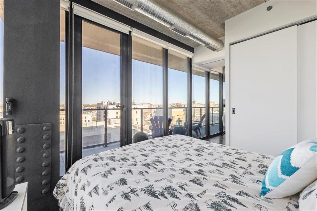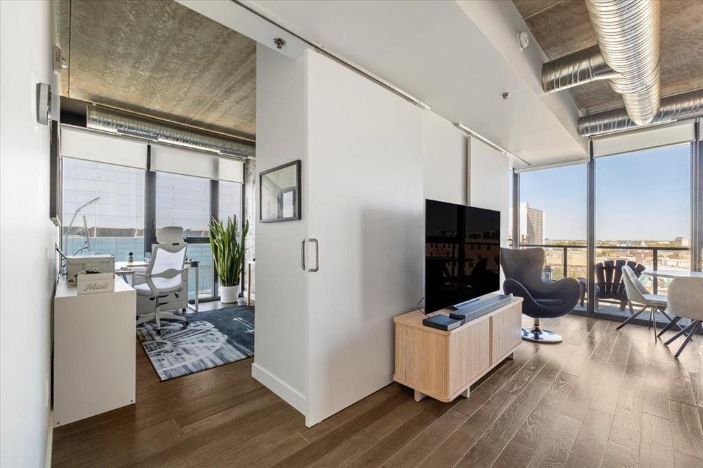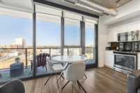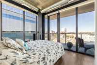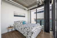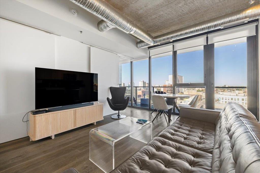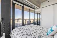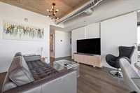 Floor-to-ceiling windows showcase sweeping city views while exposed concrete and steel beams add striking industrial character. Custom blinds provide privacy when needed. Stylish barn doors open to two spacious bedrooms, creating a modern loft-inspired layout.