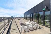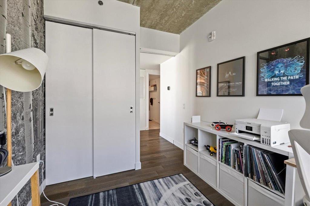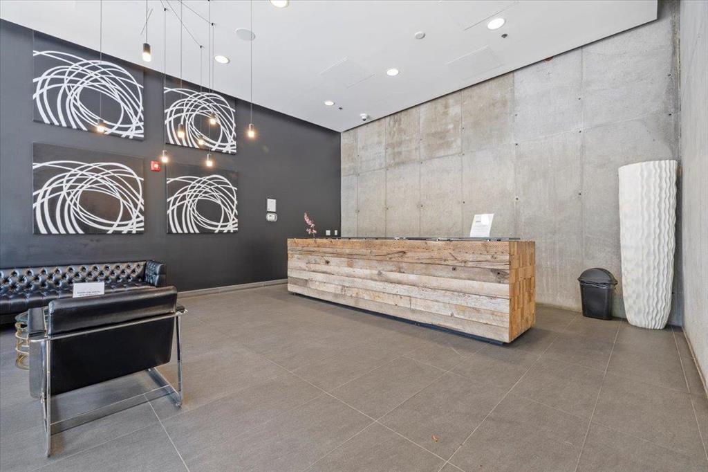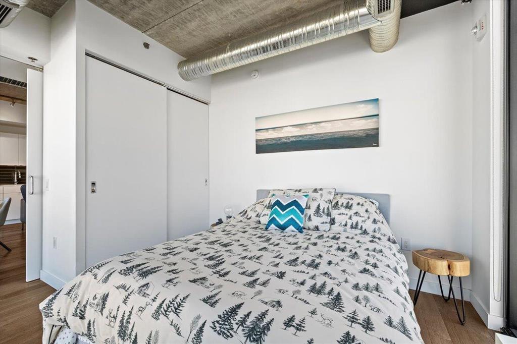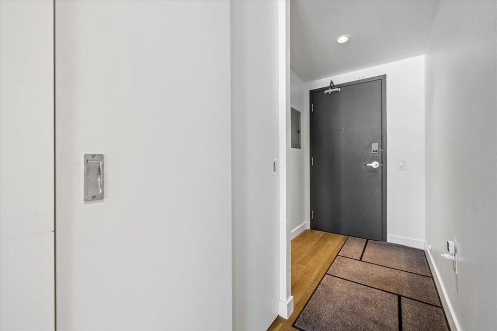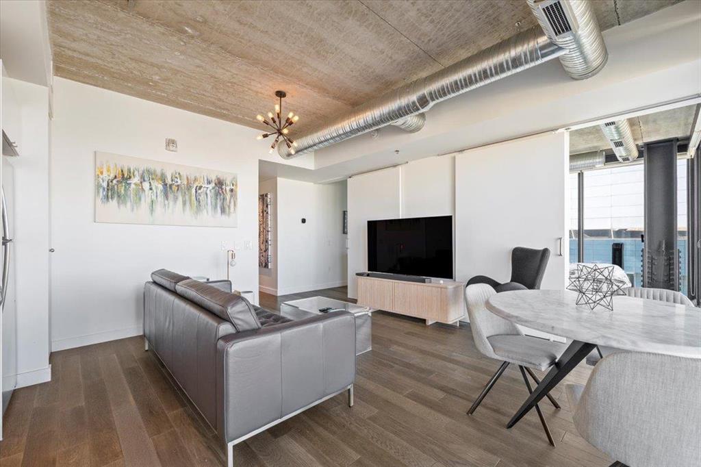 Floor-to-ceiling windows showcase sweeping city views while exposed concrete and steel beams add striking industrial character. Custom blinds provide privacy when needed. Stylish barn doors open to two spacious bedrooms, creating a modern loft-inspired layout.