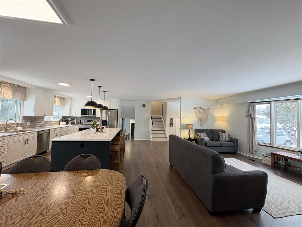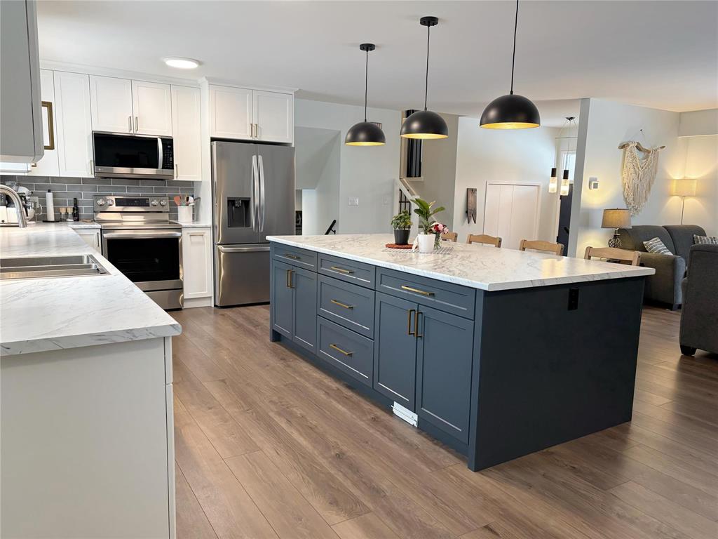 SS Sun Mar 15. OH Sunday Mar 22 1-3pm. Offers as received but leave open for 24 hrs. Spacious 4-bdrm family home featuring recently renovated dream kitchen w/large island, stainless steel appliances, & open-concept living. Kitchen flows seamlessly into the dining & living areas, w/island seating & a generous dining space perfect for entertaining. New flooring runs throughout all 3 levels, creating a bright & modern feel. Family room offers patio doors leading to a beautifully manicured backyard complete w/a stunning fire pit area—perfect for gatherings & relaxing evenings. Located close to schools, rec facilities, & playground, this home offers the convenience today’s families are looking for. The layout includes four bedrooms, two full bathrooms, and an additional half bath, providing plenty of room for a busy household. Basement adds extra versatility w/a large play or work area. Recently updated furnace & air conditioning systems provide year-round comfort & efficiency. An attached double garage & durable paver stone driveway add practicality & curb appeal. Beautifully treed yard offers a private retreat, making this a fantastic opportunity to settle into a welcoming, family-friendly neighborhood.