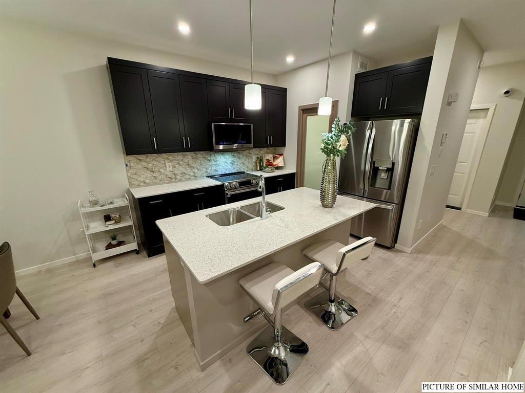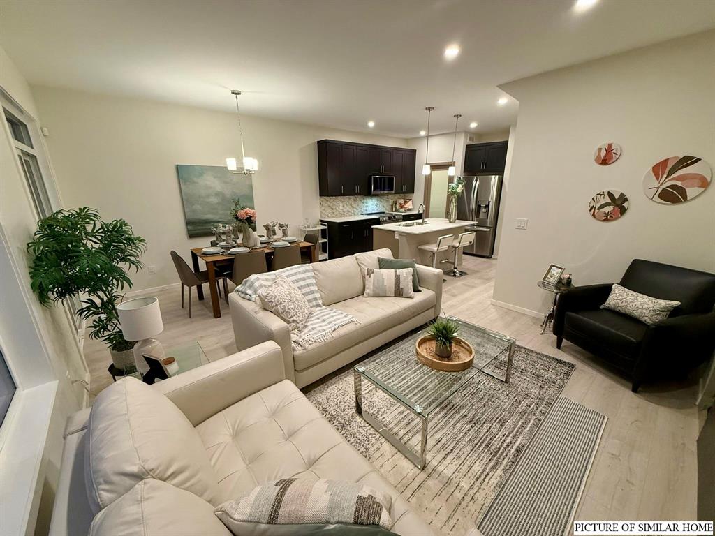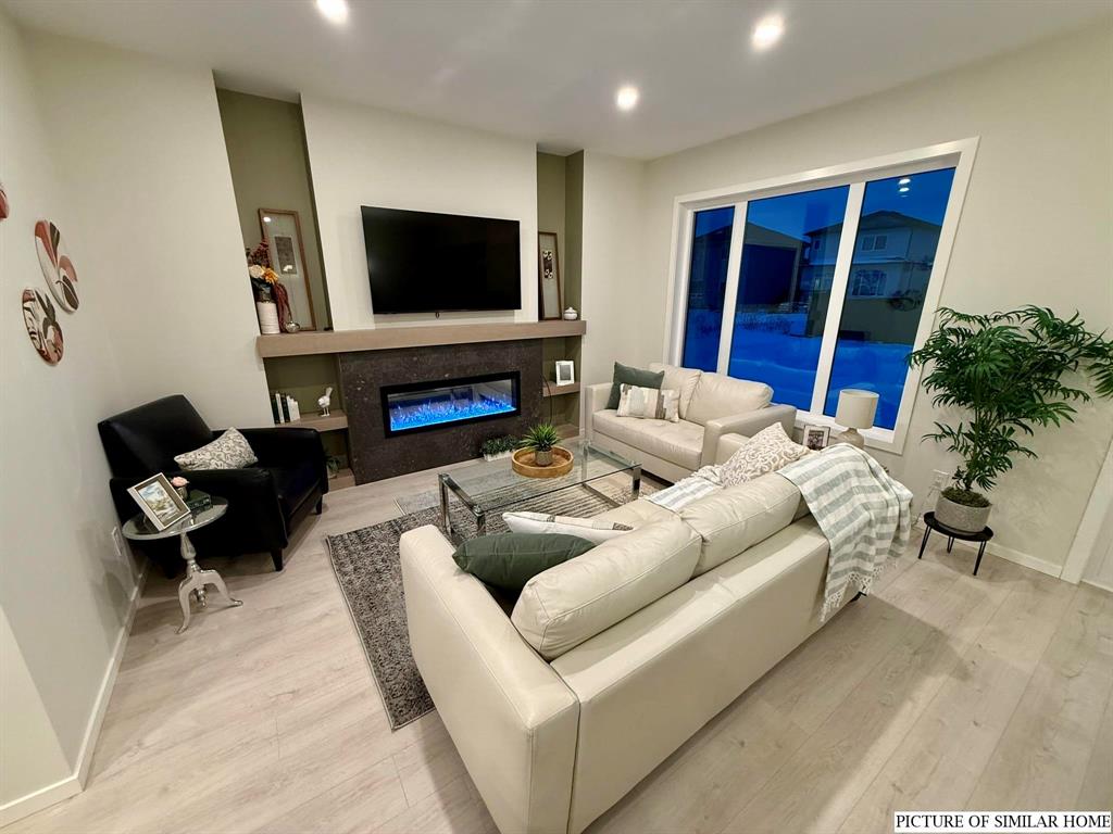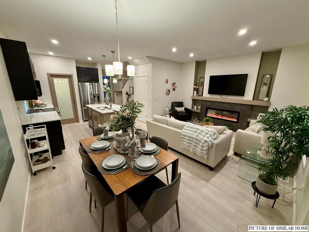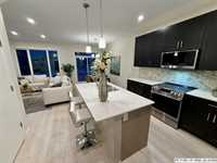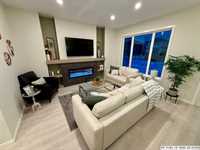 room with entertainment centre & linear fireplace. Island kitchen with quartz counters, eating bar and pantry. Spacious Dining area w/patio doors