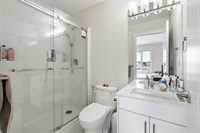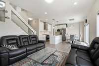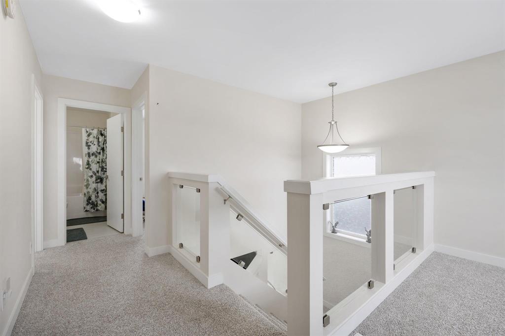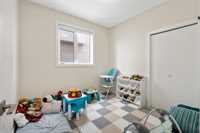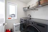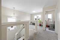 The upper level offers a spacious primary bedroom with ensuite, two additional bedrooms, a loft area, convenient second-floor laundry, and a full common bathroom. Additional features include quartz countertops in kitchen and bathrooms, upgraded lighting package, side entrance, wider concrete driveway and approaches, and completed front landscaping.