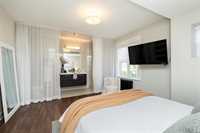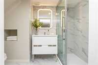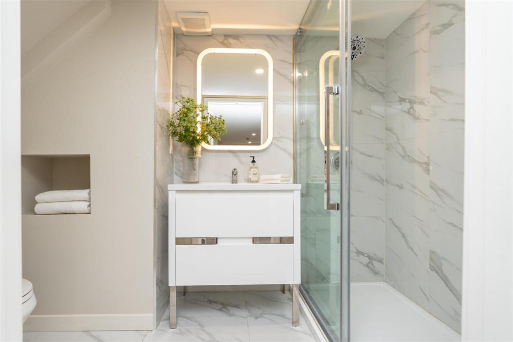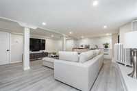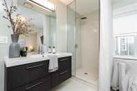tiled walk-in shower and glass wall. The lower level impresses with a bright, open-concept layout, a full wet