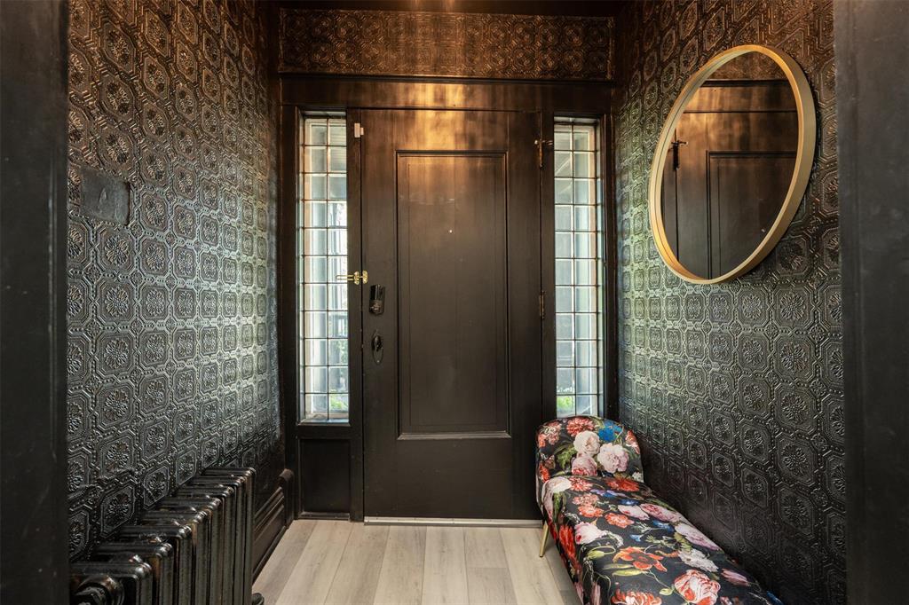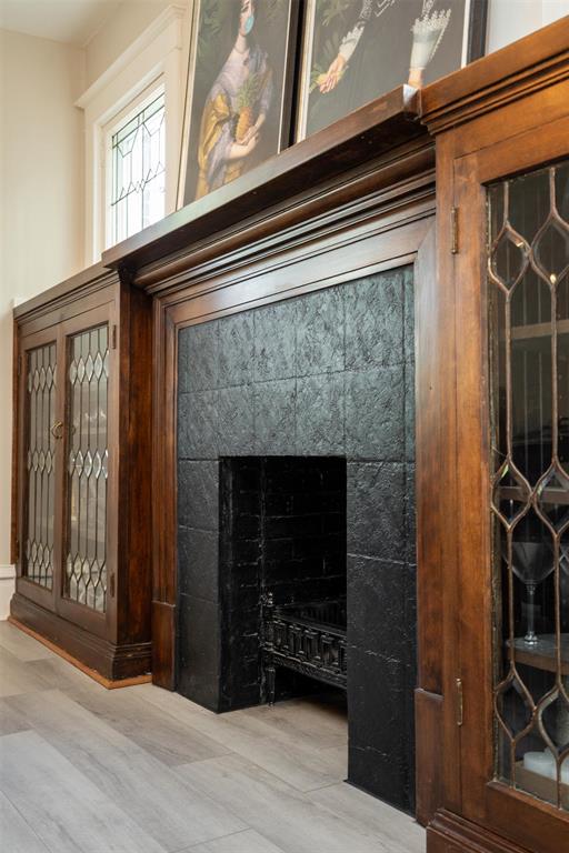 original detail—bevelled glass built-ins, decorative fireplace, pocket doors, and oak trim—this timeless