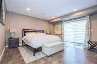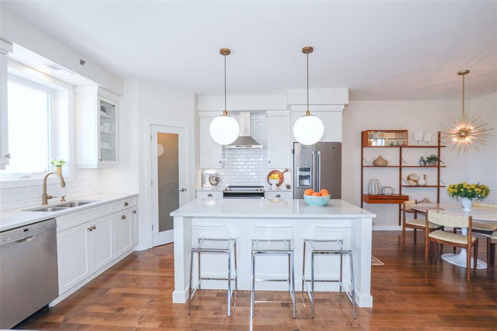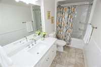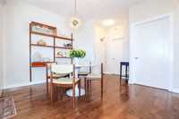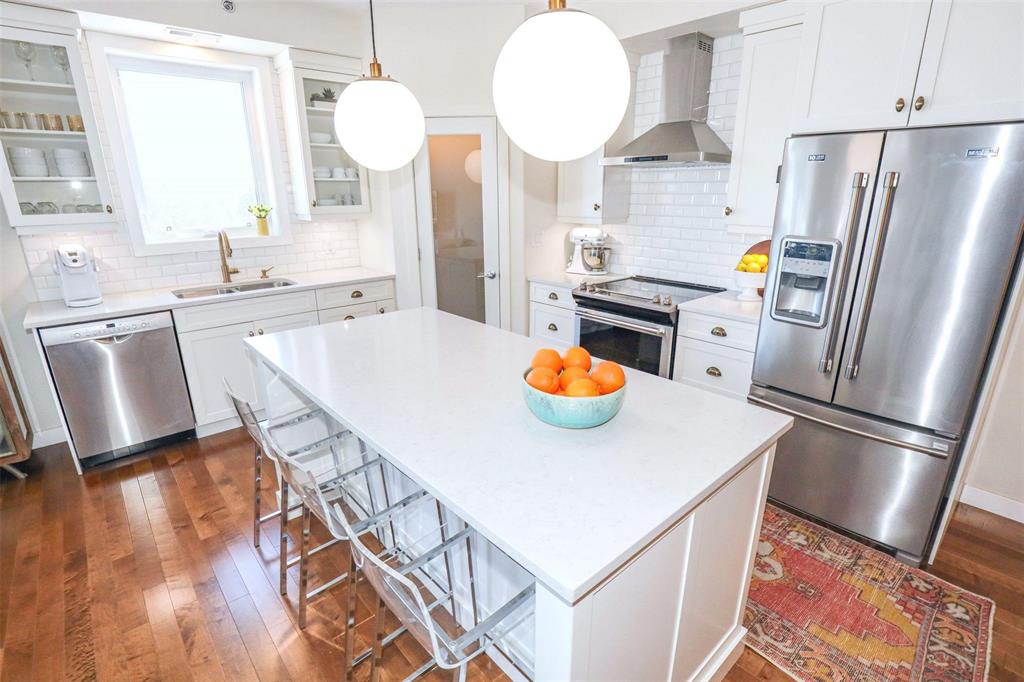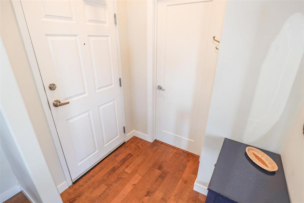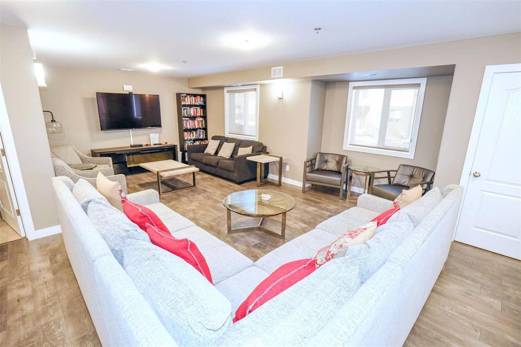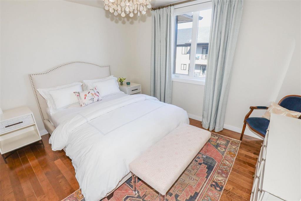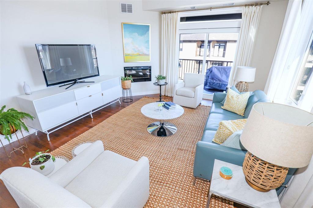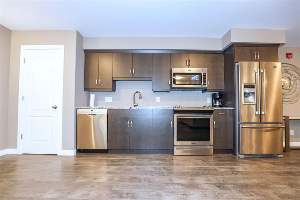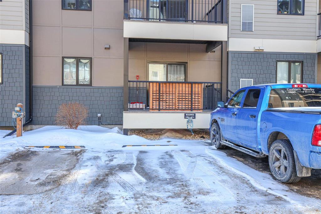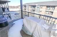 OPEN HOUSE Saturday April 4 1:30 to 3:00.Bright and spacious 1,119 sq ft top floor corner unit with 9 ft ceilings, extra windows, and a covered balcony with a river view. The open-concept design features a stylish white kitchen w/large island, shaker cabinetry, quartz countertops, subway tile backsplash, corner pantry, SS appliances, and window above the undermount sink. The dining area provides excellent space for entertaining and includes a teak shelving unit. The comfortable living room offers a f/air electric fireplace and patio doors to the balcony. The primary bedroom includes a walk-in closet w/built-in safe and a 3-piece ensuite, while the second bedroom is ideal for guests or a home office. The main 4 pce bath features a one-piece tub and quartz vanity. Toffee maple hardwood floors run throughout, complemented by 12"x24" tile in the bathrooms and laundry. Additional features include in-suite laundry w/stackable washer/dryer, storage cabinet, and HWT. Comes with separate storage, one heated underground parking stall plus an outdoor plug-in stall. Residents enjoy access to two common rooms and a rentable guest suite. Pet-friendly building.