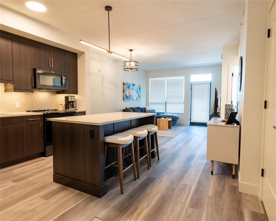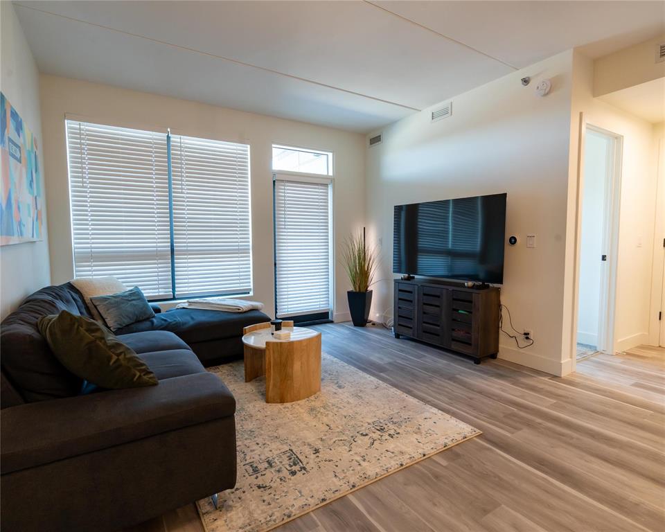 The bright, open-concept layout features 9-foot ceilings and expansive windows that fill the space with natural light. The contemporary kitchen is equipped with four stainless steel appliances and flows seamlessly into the living and dining areas—perfect for entertaining. LVP flooring runs throughout the main living spaces, with carpeting in the bedrooms for added comfort.
