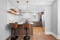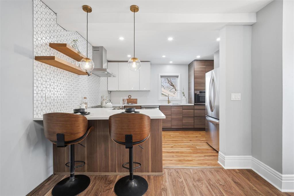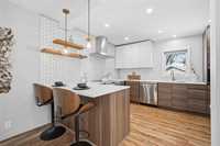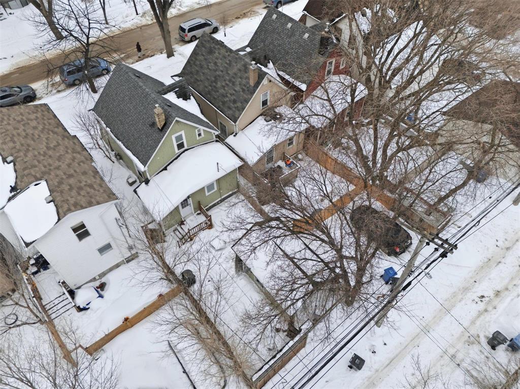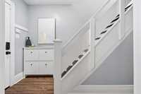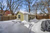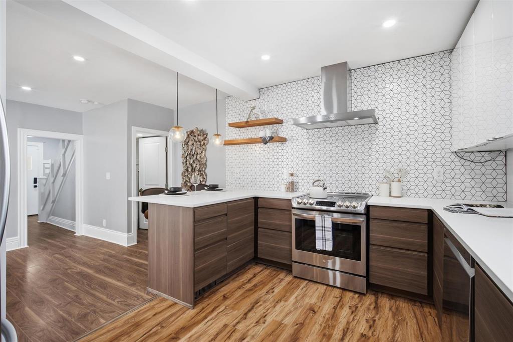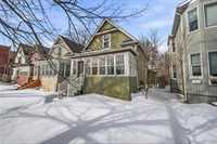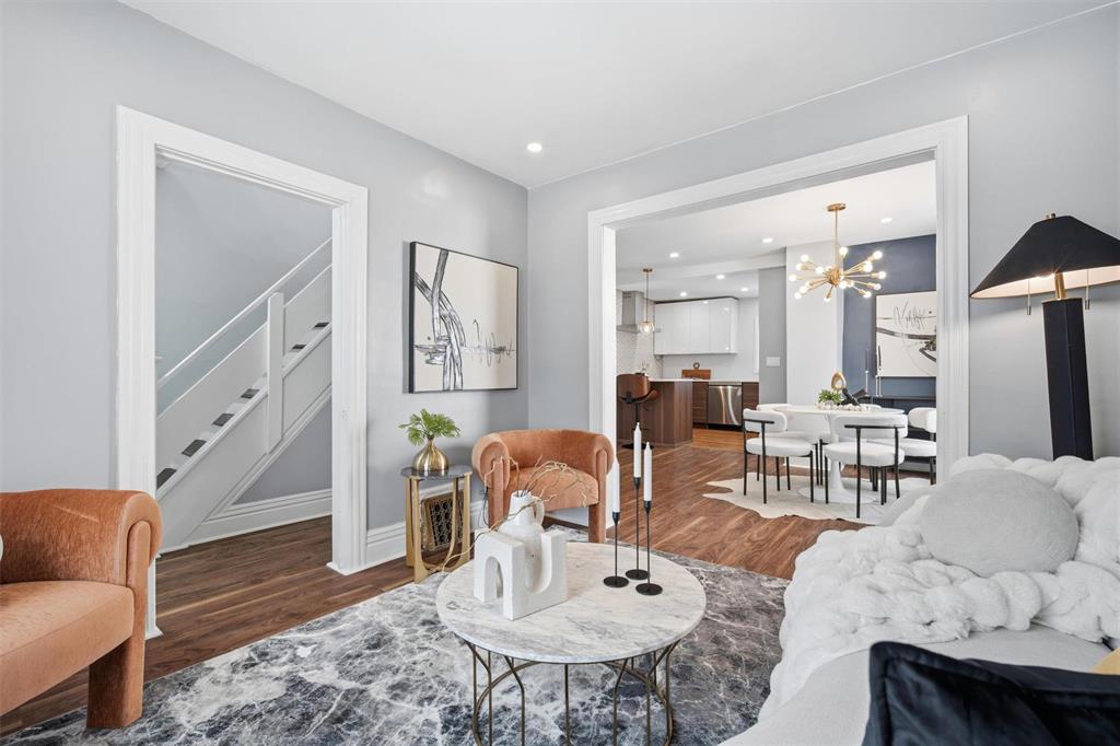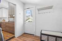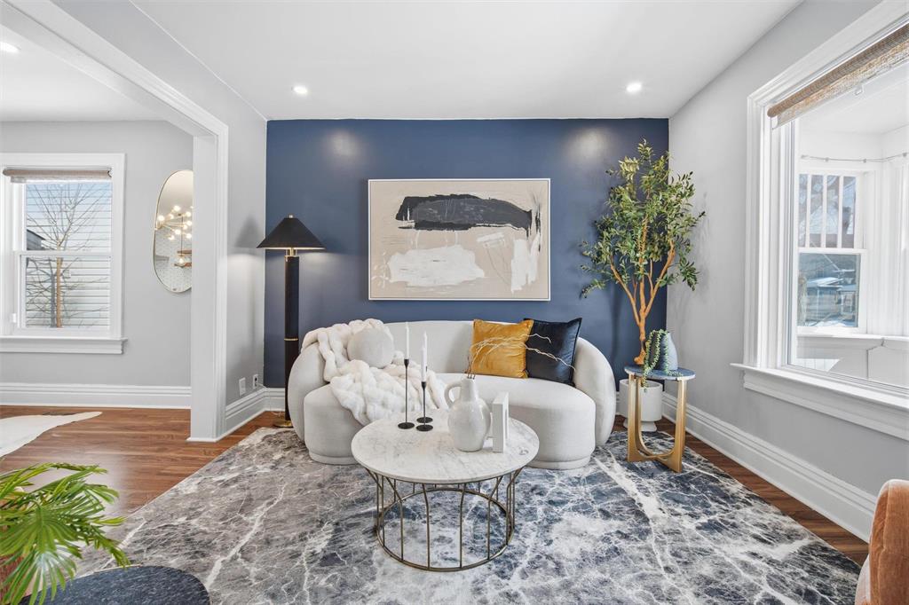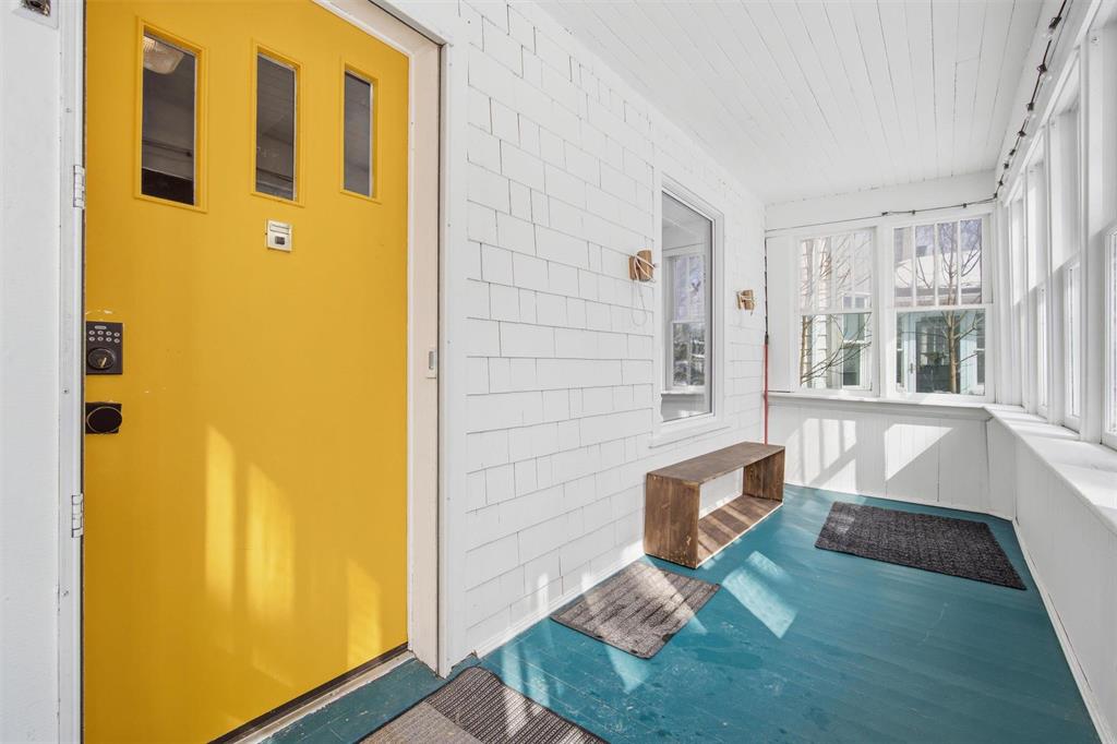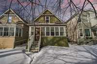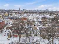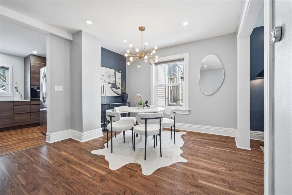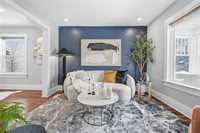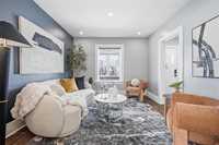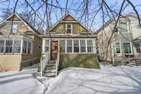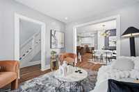Inside offers a blend of original charm and thoughtful updates. The updated kitchen includes quartz countertops and a large peninsula that opens into the dining and living areas. The dining space is bright with a large window and retains vintage character details. A rear mudroom with main floor laundry adds everyday convenience.