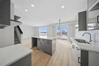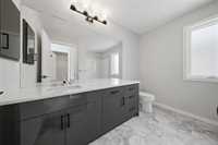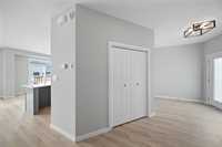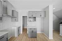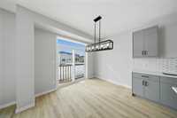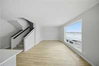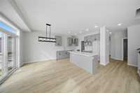 The open-concept main floor features 9-foot ceilings, elegant laminate flooring, and an abundance of natural light through larger windows. The modern kitchen is beautifully finished with upgraded glossy cabinets, quartz countertops, and 36-inch cabinetry, offering both style and functionality.