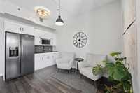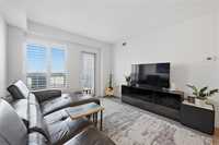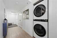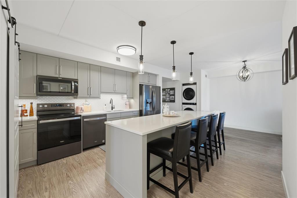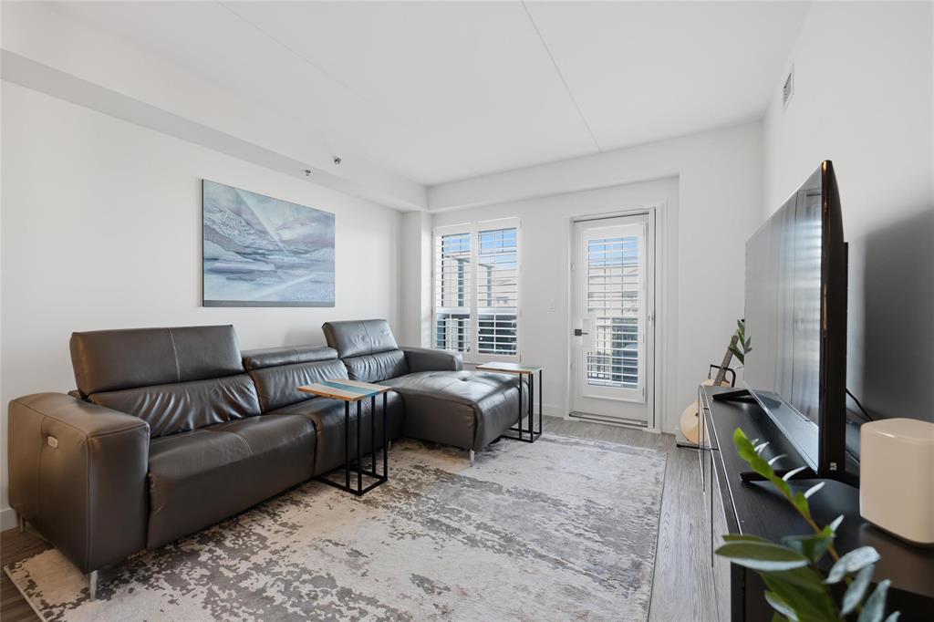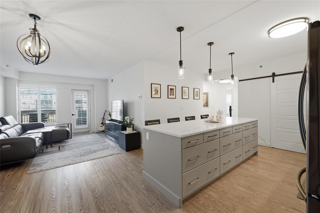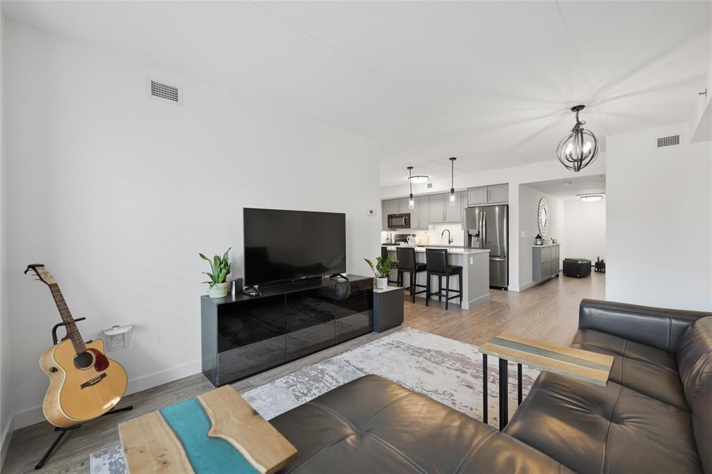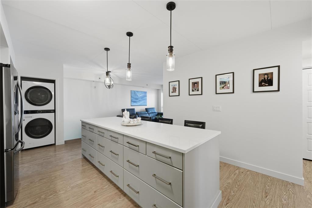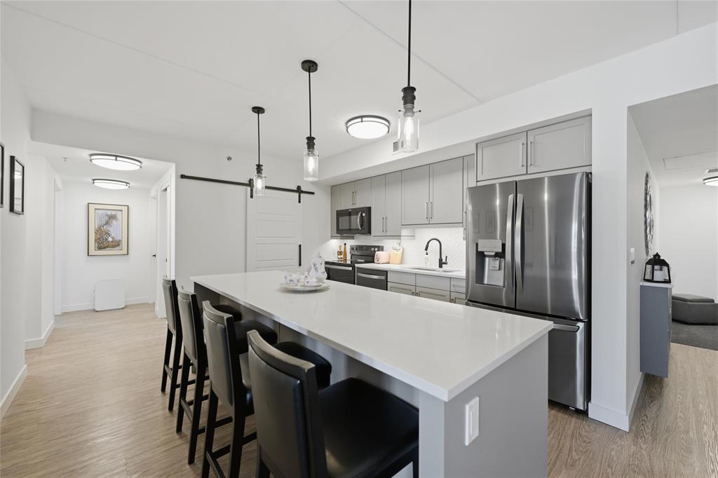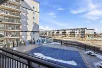 Showings start now. The Rise, concrete construction. Choice corner unit location, bright spacious beautifully maintained 2 bedroom, 2 bathroom, large living room, garden door to balcony, dining room, spectacular kitchen, large breakfast island, extra roll-out drawers, quartz counters, barn door to walk-in pantry, room for freezer, in-suite laundry, 3 piece ensuite off Primary bedroom with walk-in shower, PLUS 2 parking stalls, one inside one outside. Welcoming common room, gym plus outdoor pool. Close to Altea, Bridgwater Centre stores and walking & biking trails. Book your appt today.