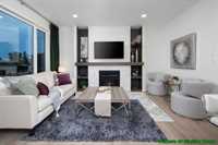 The great room features a tiled fireplace and built-in entertainment centre, flowing into the dining area and exceptional kitchen design with large island, quartz countertops, walk-in pantry, and beautiful cabinetry.
