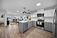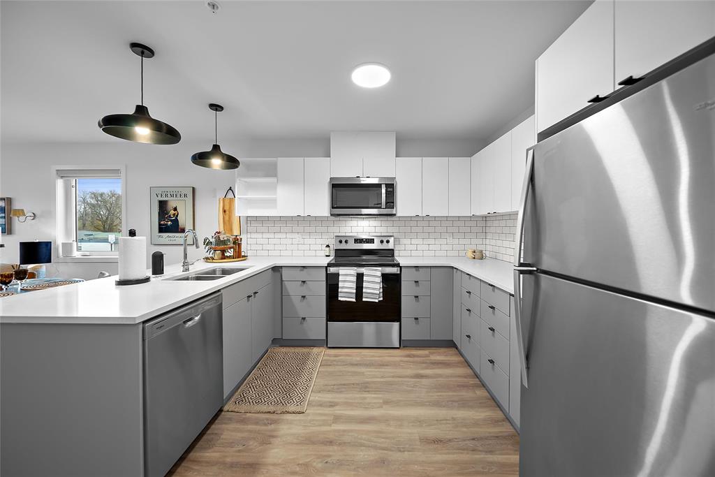 • Modern Kitchen with high-end appliances, quartz counters and tiled backsplashes