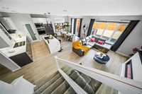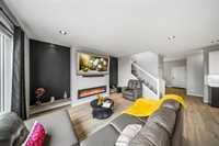 The chef-inspired kitchen features premium black stainless steel appliances, induction cooktop, built-in oven, quartz waterfall island, and spacious dining area. The living room showcases a custom feature wall with sleek fireplace—perfect for comfort and entertaining.