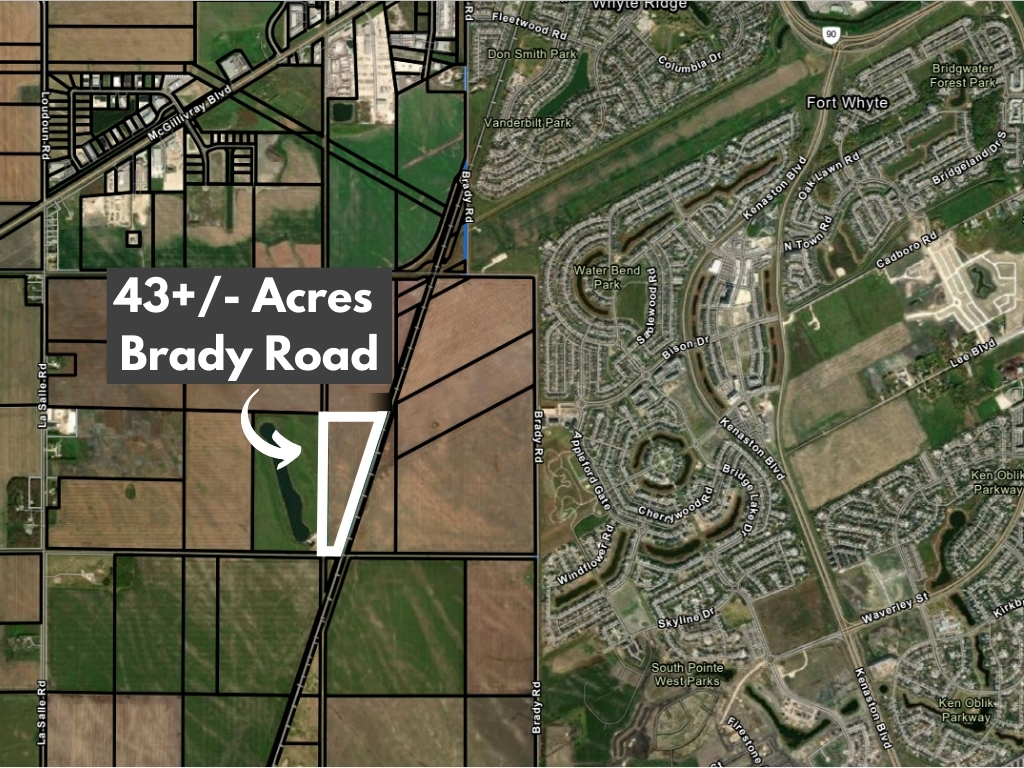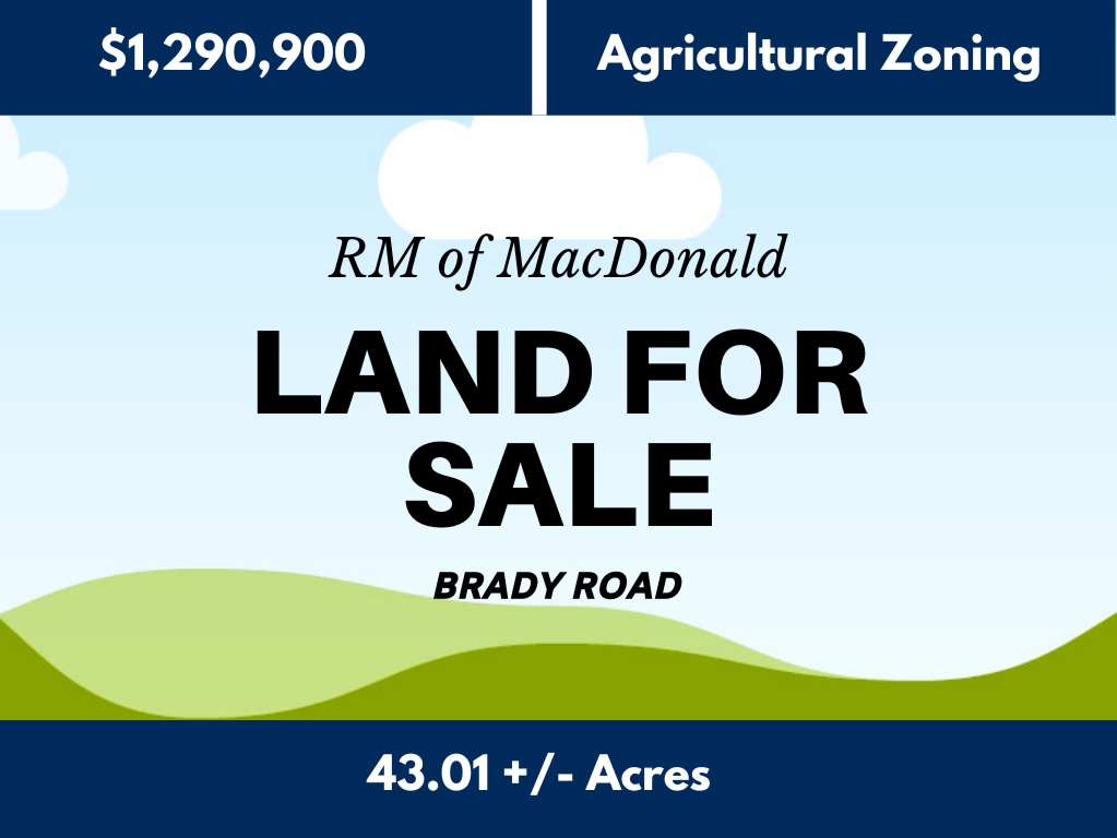 The RM of MacDonald - Brady Road, prime 43 acres +/-, vacant land, walking distance to Bridgewater. This site is located adjacent to a private water park, and near the newly developed McGillivary business park. This parcel is ideal for land banking. Buyers should conduct their own due diligence for any current or potential uses. Zoned Agricultural. Buyer may be responsible for GST. Taxes $929.66 ('22). Don't miss this opportunity.