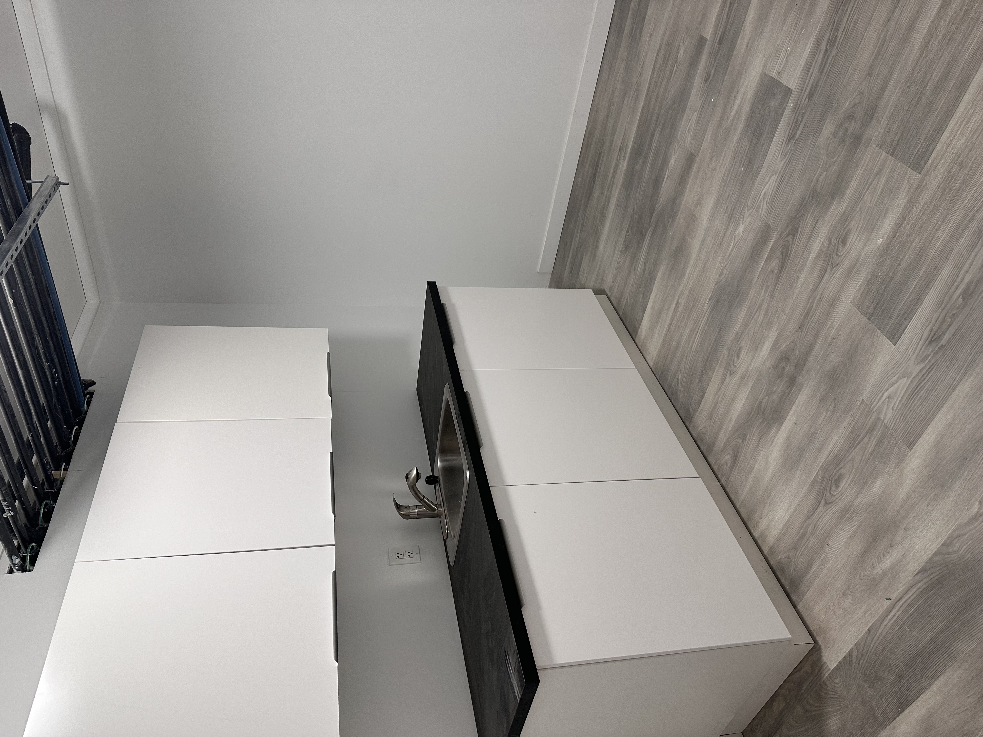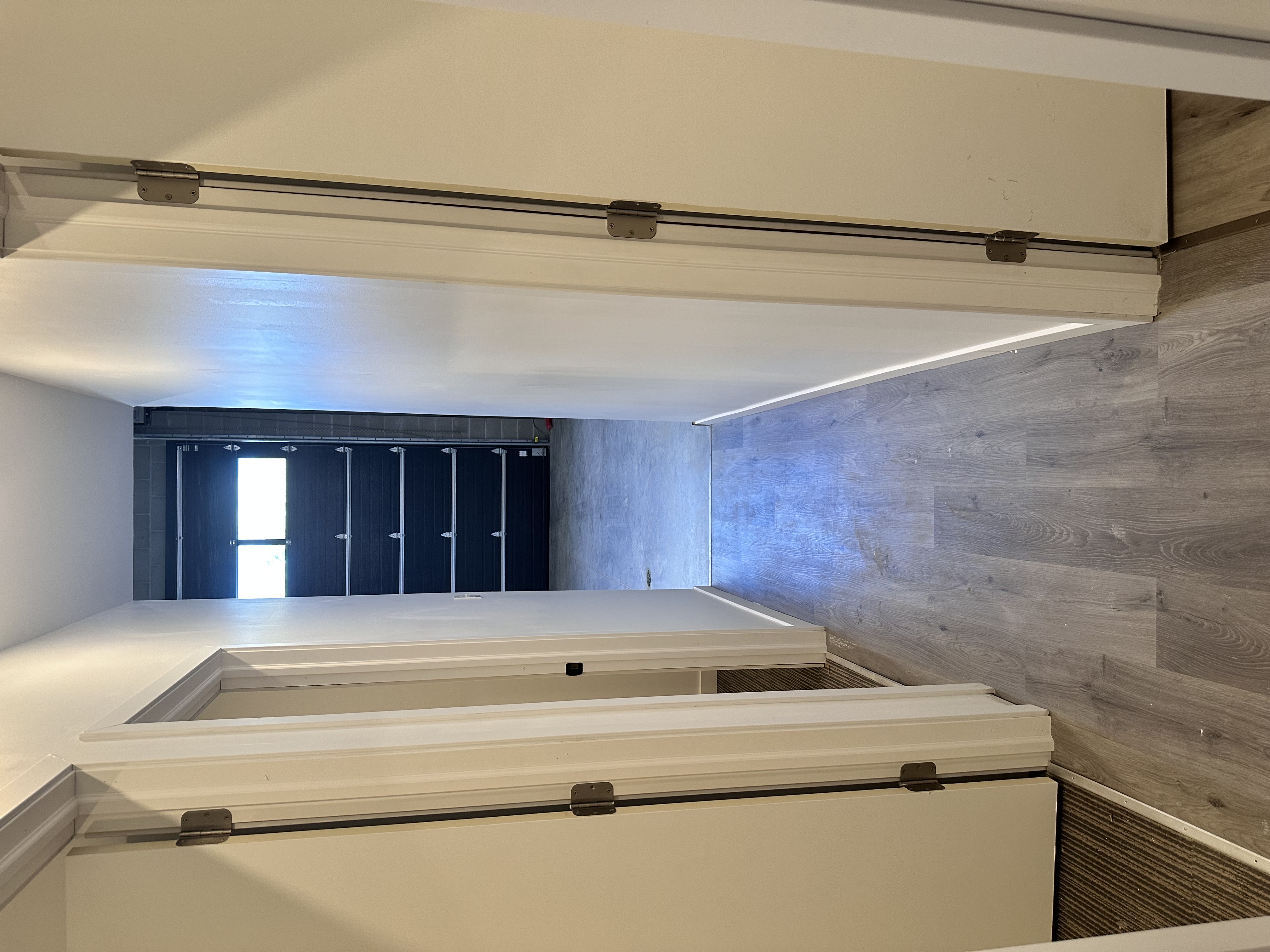 Unit 1 is fully finished and features a functional layout ideal for a variety of uses. The main floor includes two private offices, a reception area, a dedicated printer/mail room, and an open warehouse or showroom space. The mezzanine level offers a staff room with kitchenette and a boardroom that overlooks the main floor. A tenant is currently in place on a three-year lease.