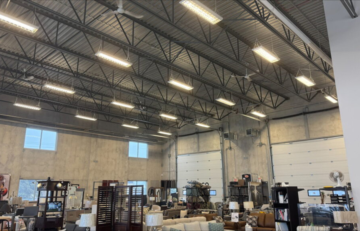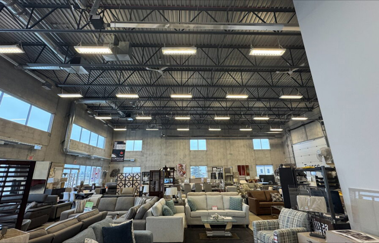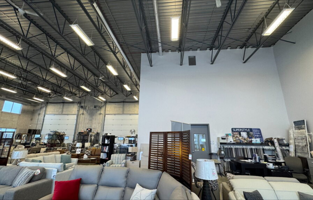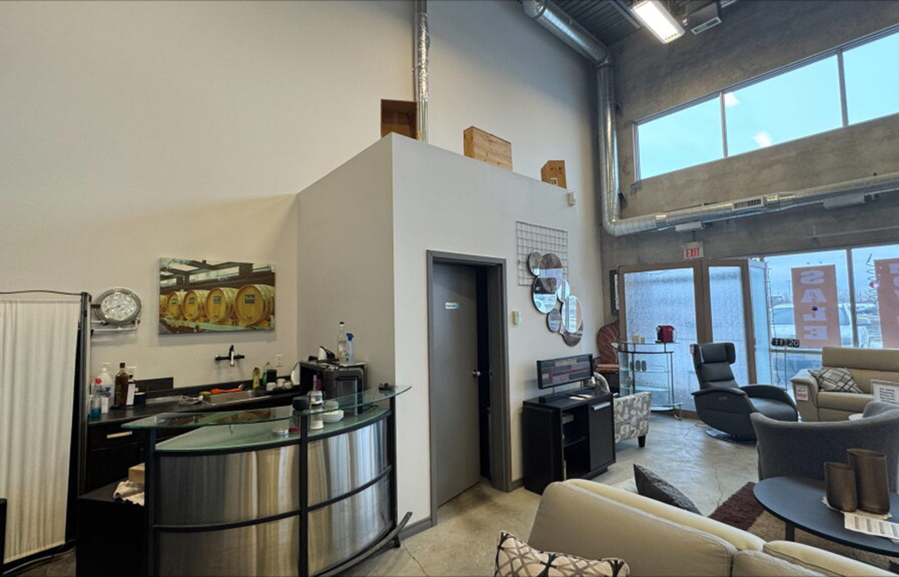 Industrial flex space, featuring a ±19’ ceiling height, multi-level glazing for natural light, a showroom, private offices, and a staff area. The office area has 3x2 Ton HVAC for heating and cooling, while the warehouse includes infrared unit heaters. The unit is equipped with 100-amp, 3-phase power (120/208) and three grade loading doors. A compound area is available at the rear, with ample parking in the front for staff and clients. Pylon signage is available.