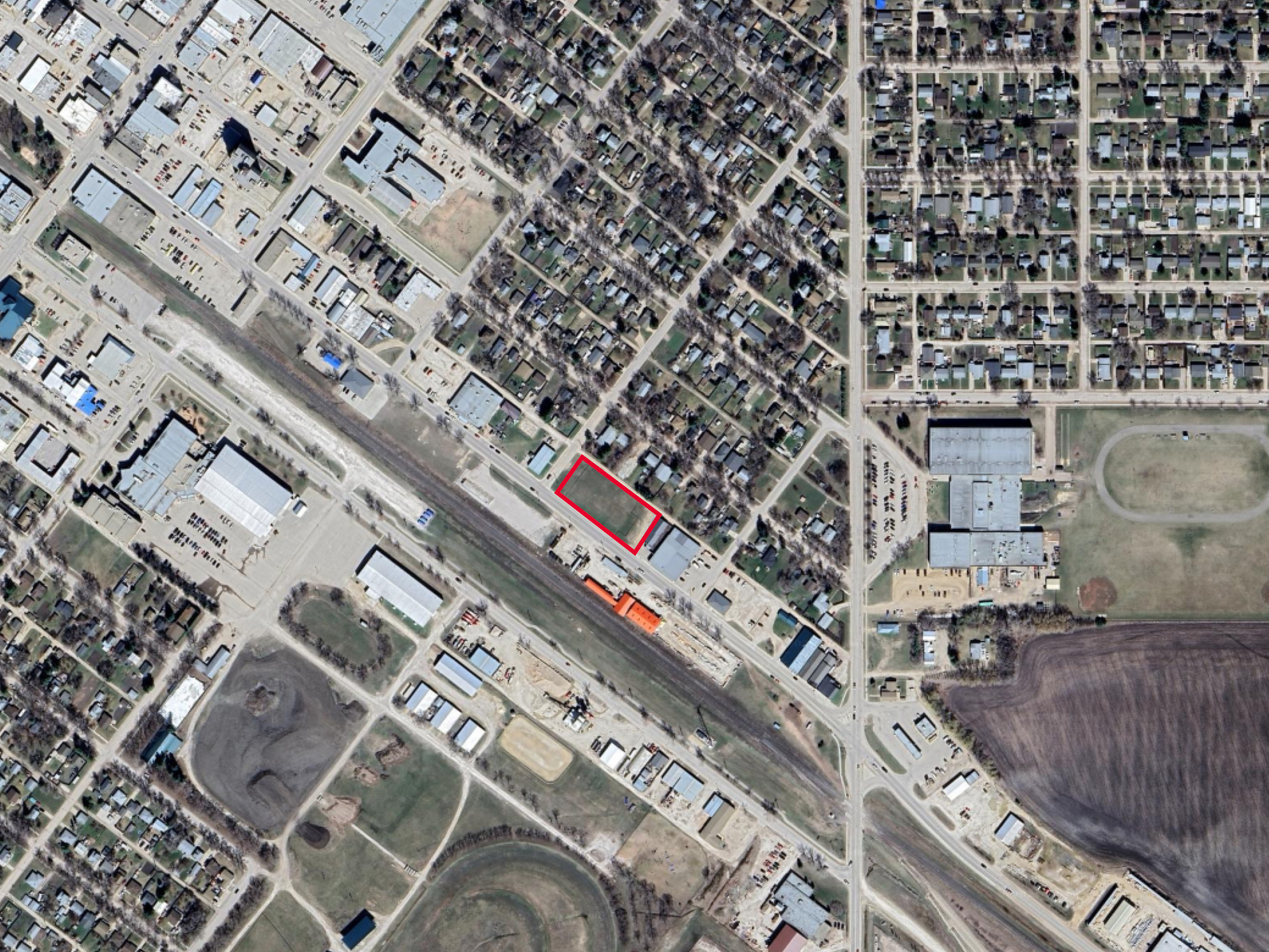 Rectangular lot located on the corner of 1st Avenue NE and 3rd Street NE, surrounded by commercial uses and fronting on a CN rail line.