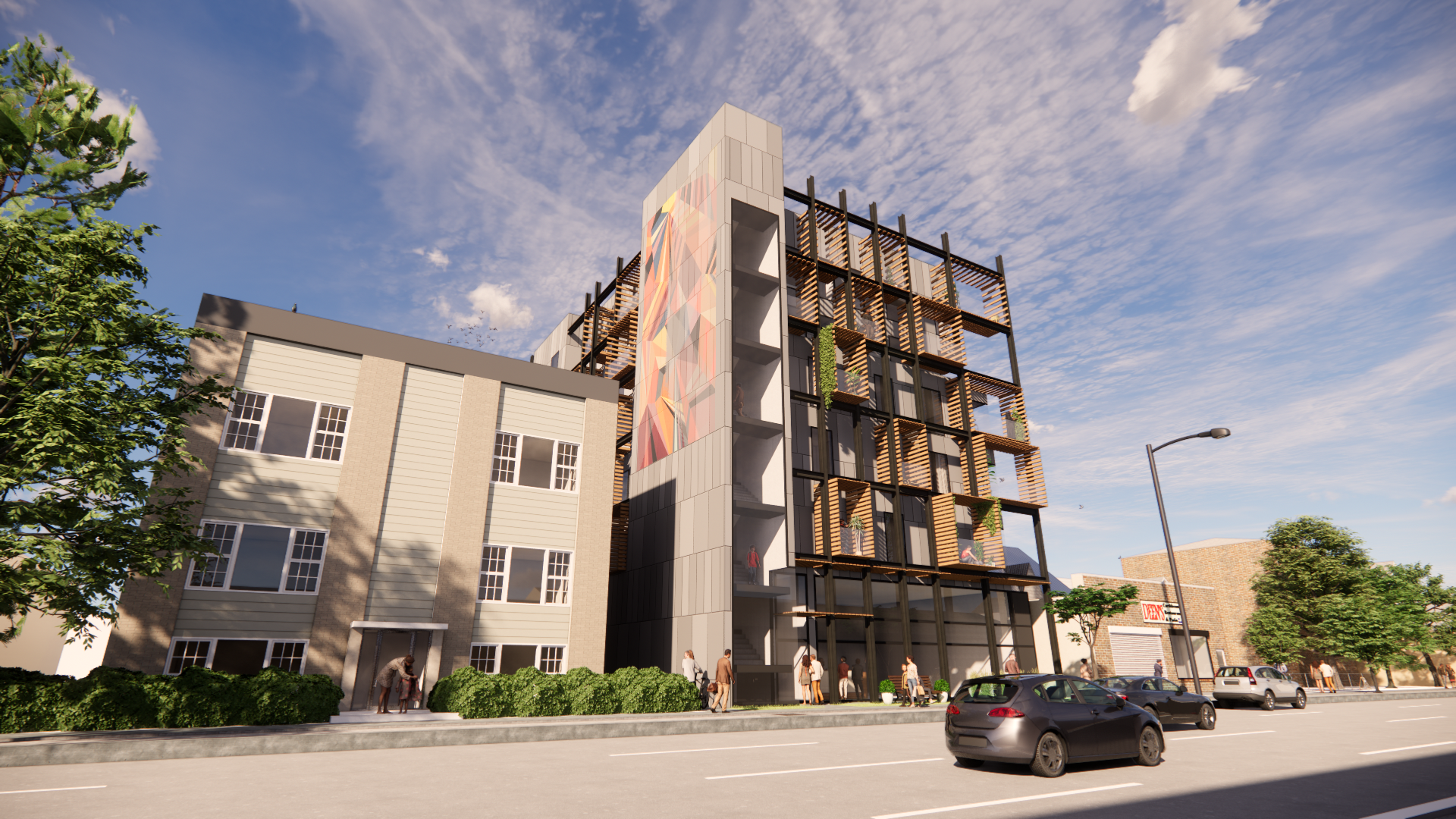 The site has been rezoned in full to RMU with plans to build a 6 storey building with 26 units, 1,951 SF of commercial space (1,415 + 536 mezzanine), and 28 parking stalls (mix of main floor and one level of underground).