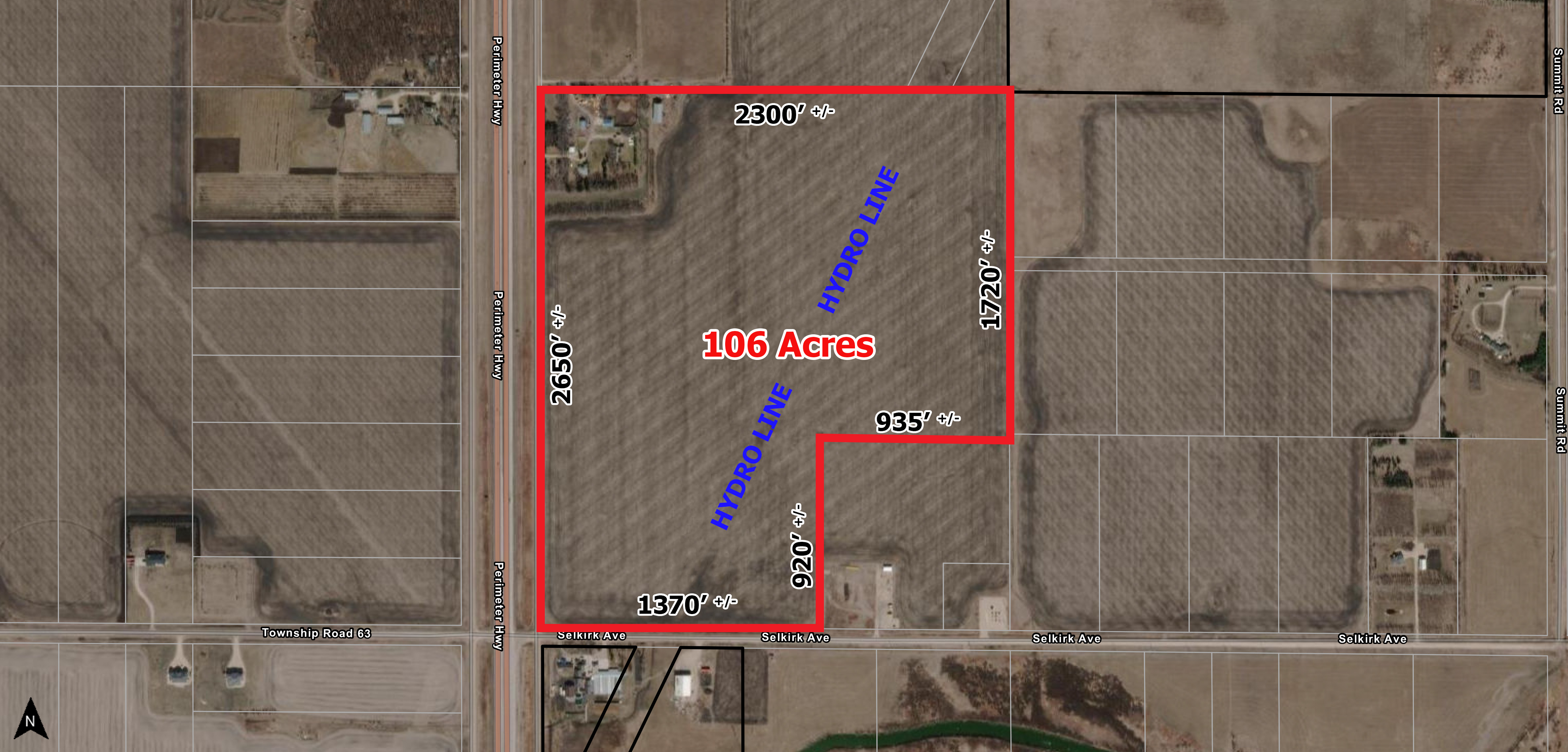 106.34 Acre parcel of vacant land for future industrial development with 2,650 ft frontage on Perimeter Highway. 7.7-acre yard site with shelter belt and 2 residences and outbuildings.