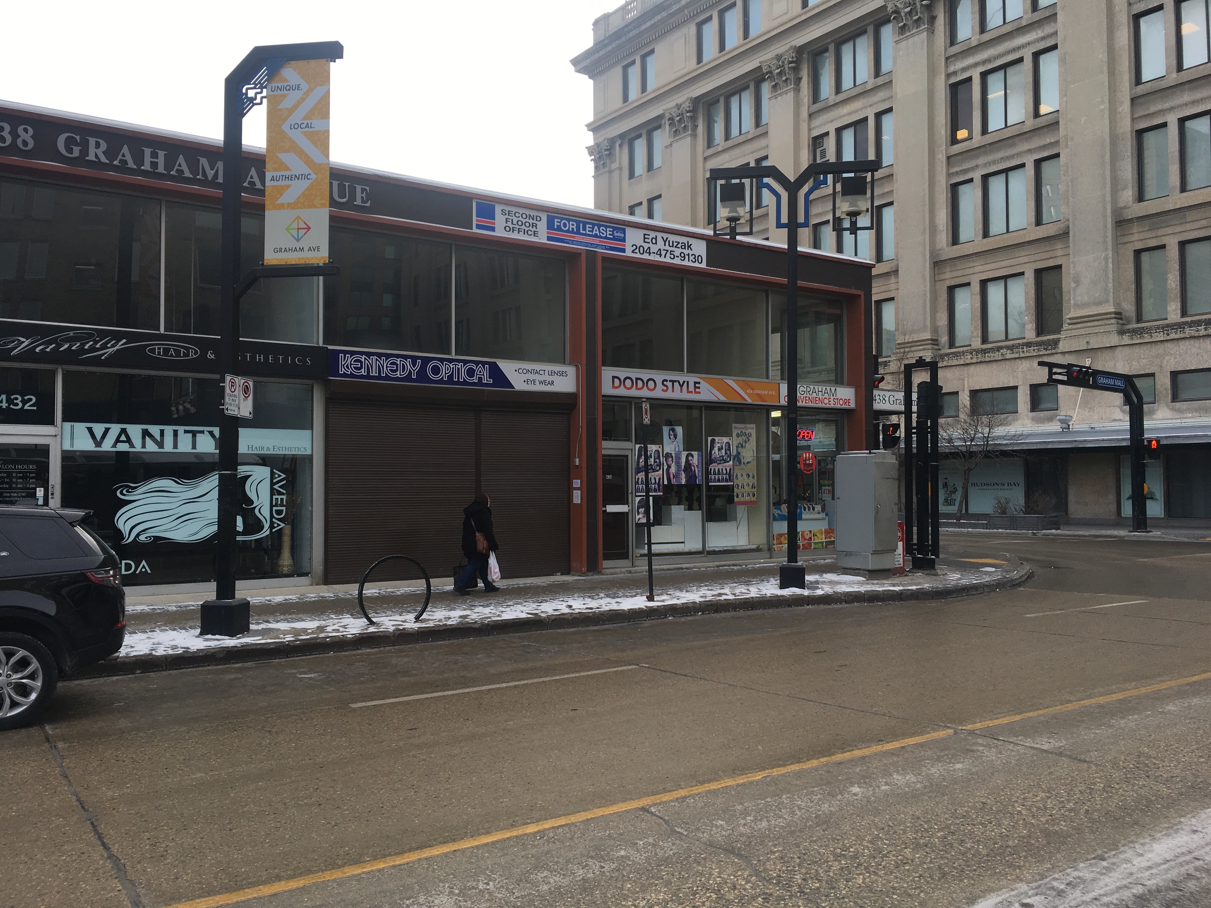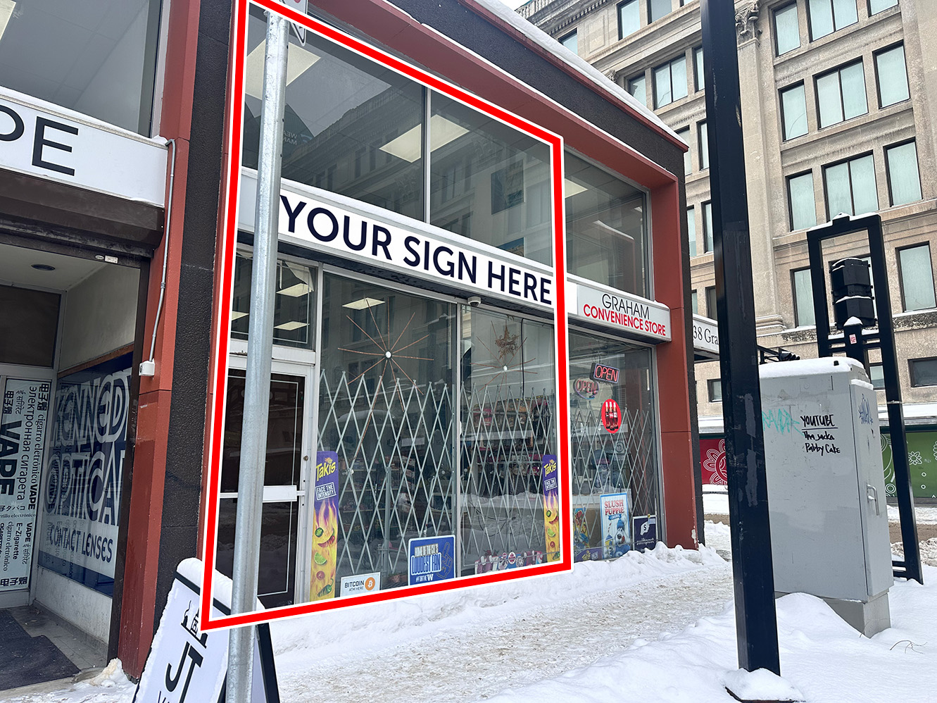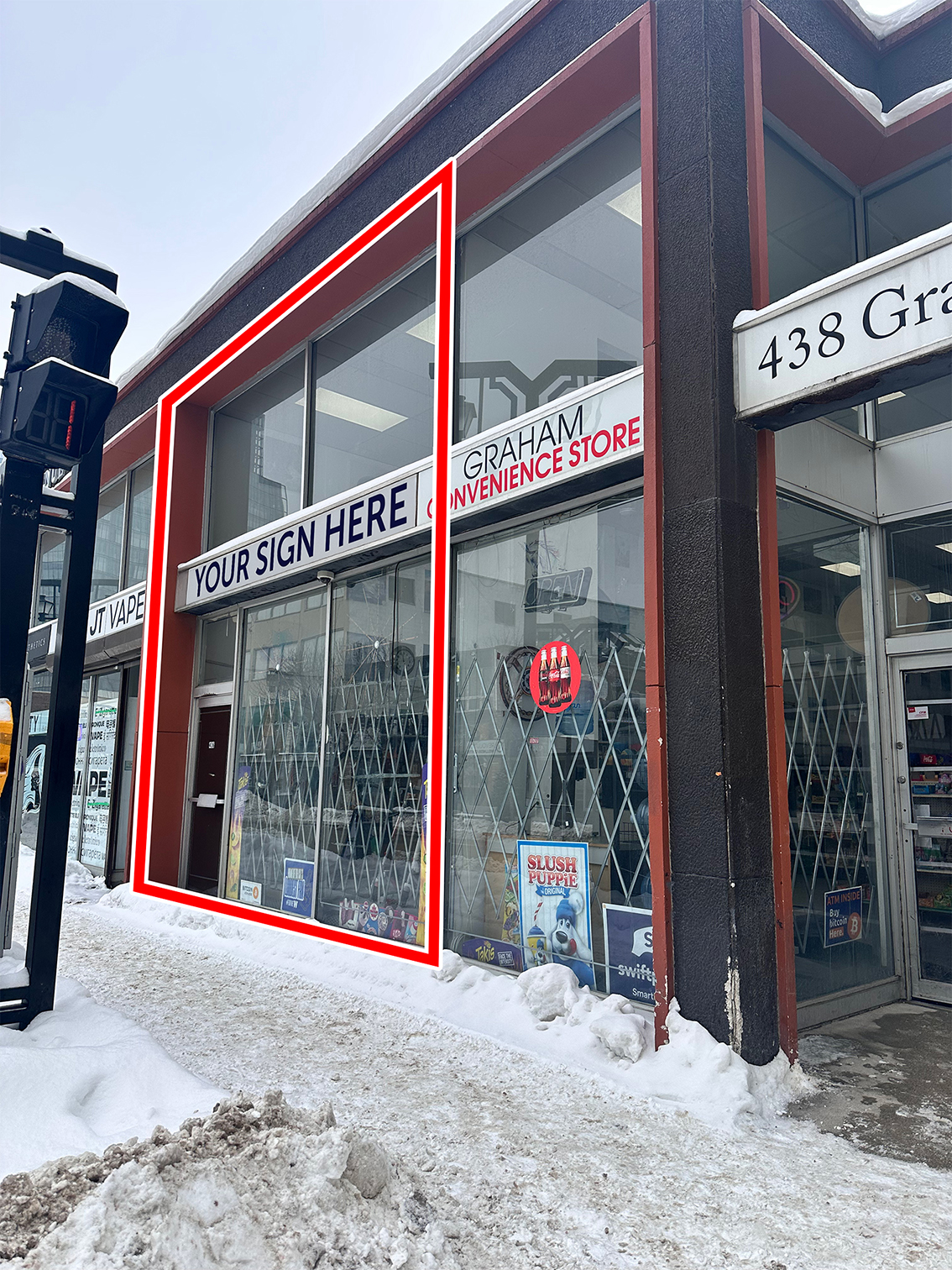 436 Graham Avenue offers a prime retail or office opportunity in the heart of the city’s central business district. This ±1,100 sq. ft. space features a wide-open layout with floor-to-ceiling storefront windows, providing exceptional natural light and strong street-level visibility for signage and branding. Located just steps from Portage Avenue, True North Square, and Canada Life Centre, the property benefits from consistent foot traffic generated by nearby office towers, residential buildings, and hospitality uses. The site is also within a short walk of the former Hudson’s Bay building redevelopment, which will introduce a major healthcare hub, new residential towers, and additional retail amenities—further enhancing activity in the area. With flexible downtown “M” zoning and immediate availability, this space presents an excellent opportunity for retailers, service providers, or office users seeking a highly visible downtown presence.