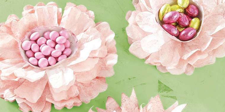 To make: Submerge regular-size white coffee filters (you’ll need four to six for each flower) in a watered-down Rit Dye solution like Petal Pink; dry completely. Cut into flower shapes of various sizes, and stack largest to smallest. Attach at centers with craft glue. Glue a homemade or store-bought candy cup or cupcake cup to the center of each. Fill with candy, preferably chocolate (Right?), and eat.
