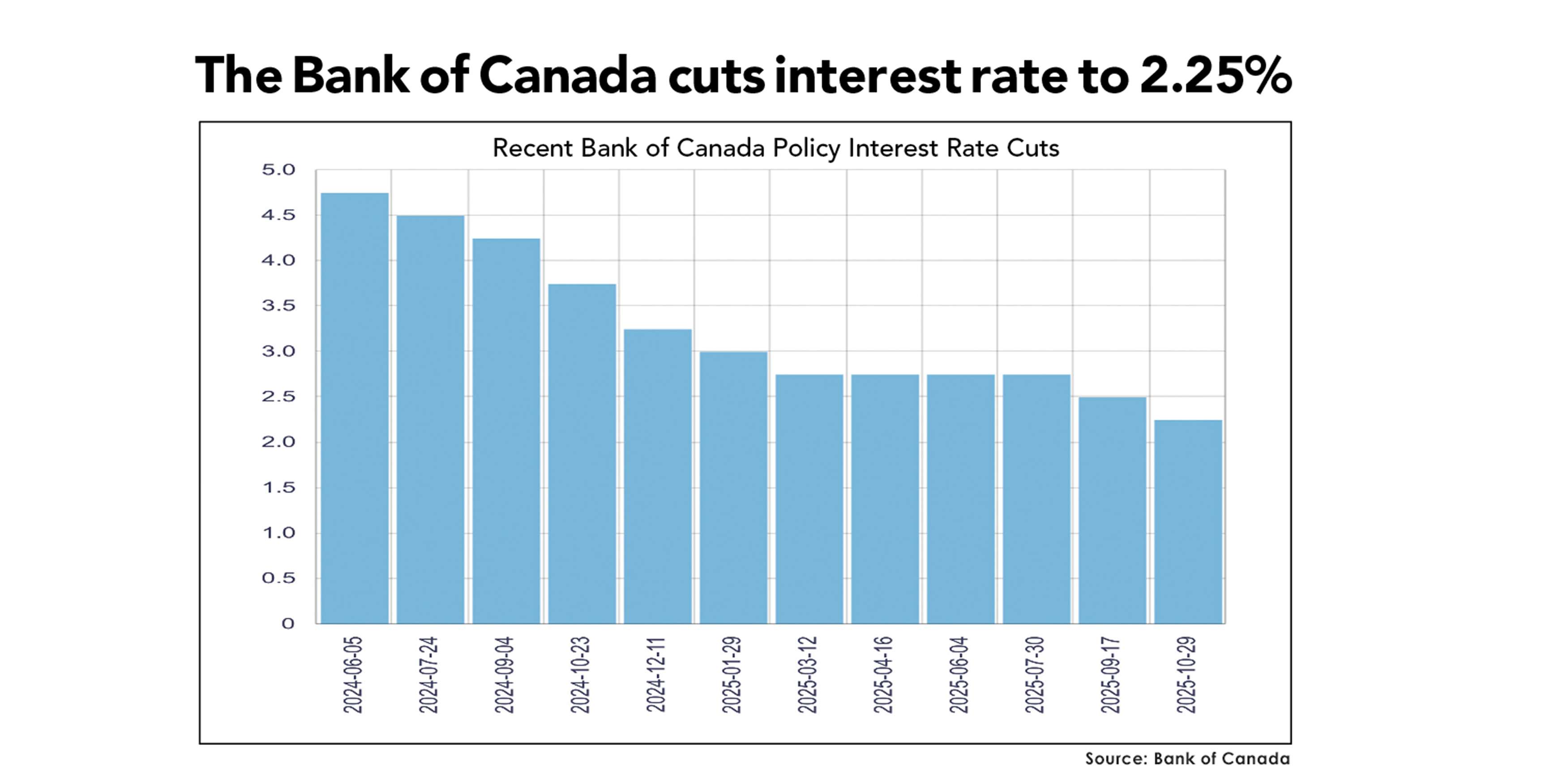 The Bank of Canada dropped its policy interest rate from 2.5% to 2.25% on October 29, making it the second 25-point cut in a row. However, this may be the last reduction we see for a while.