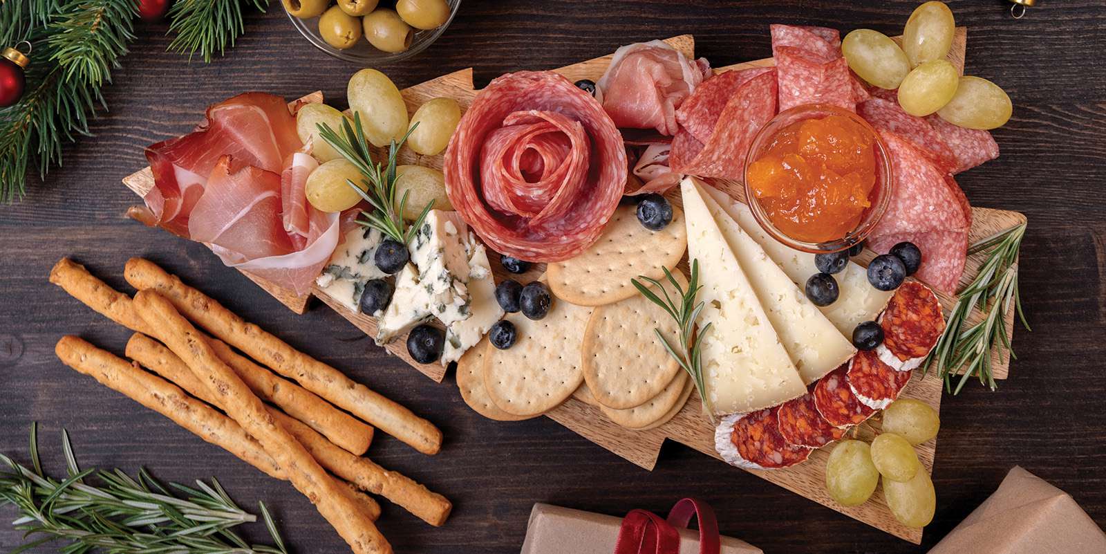 One sure-fire and extremely popular way to simplify a gathering — or even a quiet evening for two — is by creating a charcuterie board. Not only is it fun to put together, it’s a visually stunning feast for the eyes as much as it is for the appetite. It’s also extremely flexible. It can be a single board for a small group, or an entire tabletop spread for a larger gathering. It can be presented flat on a tabletop or on multiple surfaces on different levels, either on cake stands or plates set on top of decorative tin boxes, or be built up vertically in the shape of a Christmas tree.