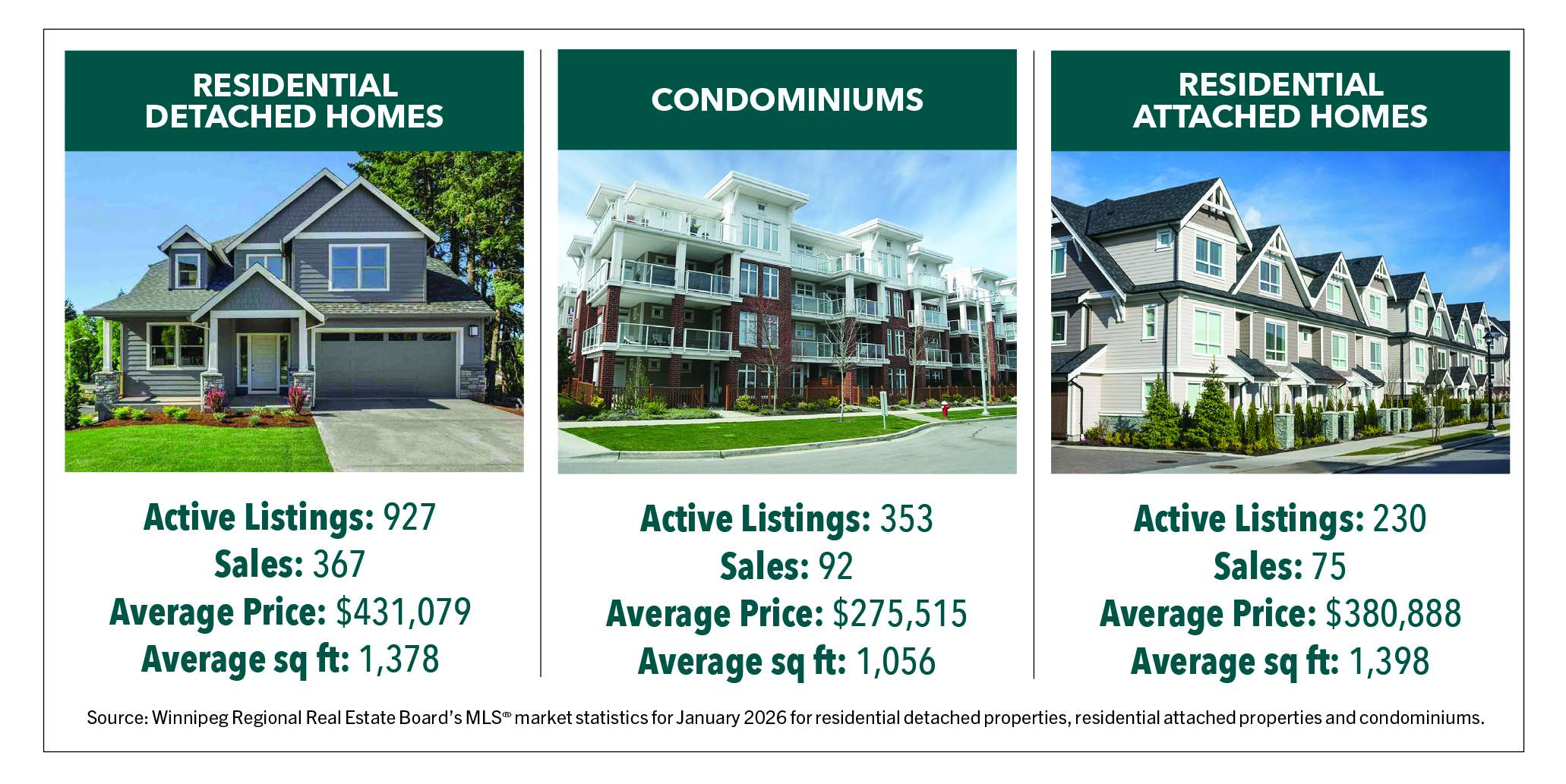 “2026 began by continuing the trend seen in 2025 with residential detached and condominium average price increases compared to last year and the 5-year average,” said Michael Froese, 2025-2026 President of the Winnipeg Regional Real Estate Board. “MLS® sales for All MLS®, residential detached and condominiums, on the other hand, were lower than last year and the 5-year average. Active listings for residential detached homes were below last year and the 5-year average while condominiums were above last year and the 5-year average.”